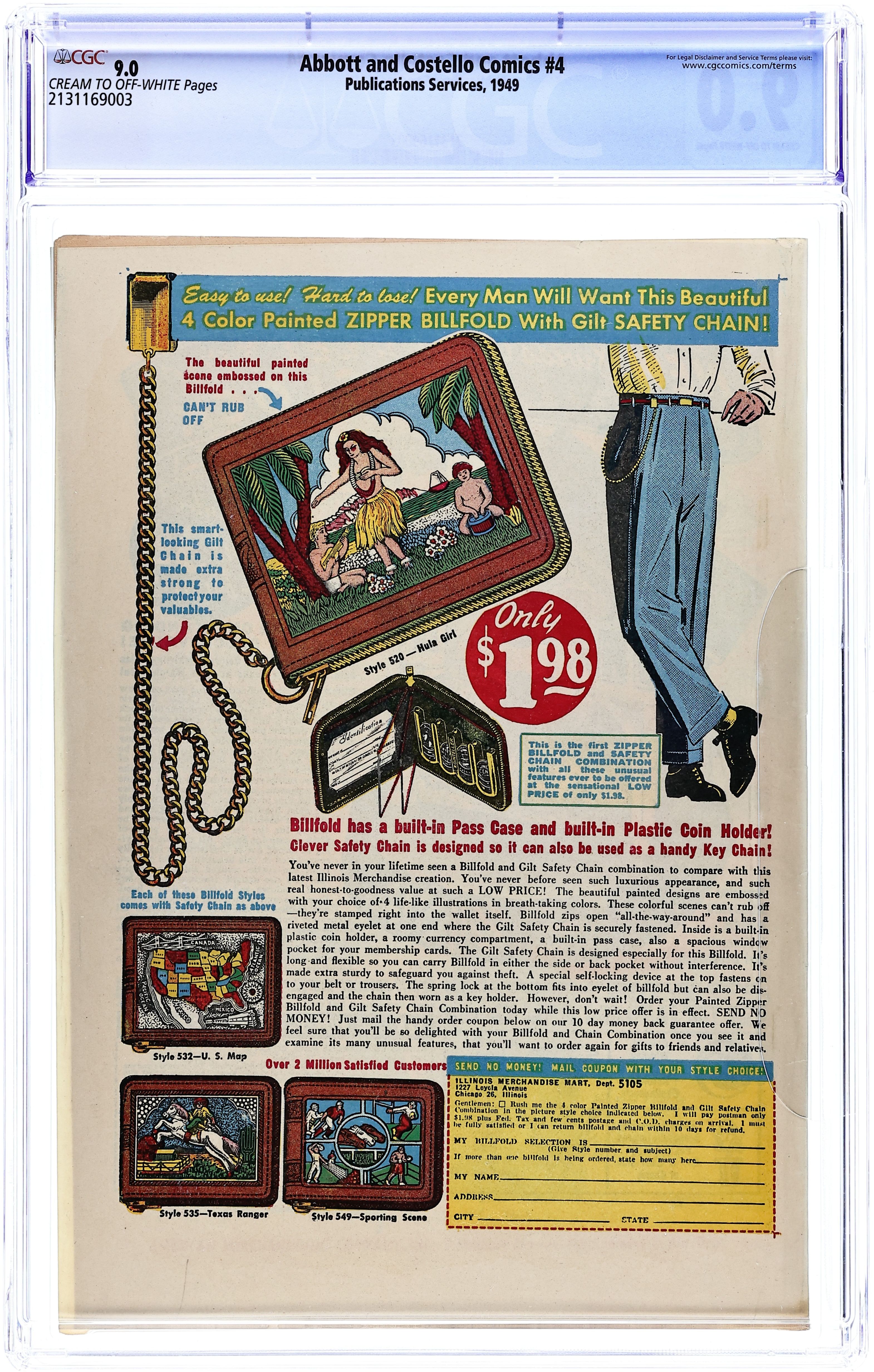 Cover by Eric Peters. The classic comedy duo of TV, radio and film starred in this comic at the height of their careers. Their clothes are lost while Bud and Lou are in the jungle, searching for the Fountain of Youth. Book collector Bibly O'Phile hires detectives Bud and Lou to find out who stole a rare book from his collection. Lou volunteers himself and Bud to carry a crate across town for a woman. The Tropics; Crate Adventure; Booked for Larceny; All That Glitters; Gag Bag; Comedy Column; Rhapsody in Black and Blue. 32 pages, Full Color. Cover price $0.10.