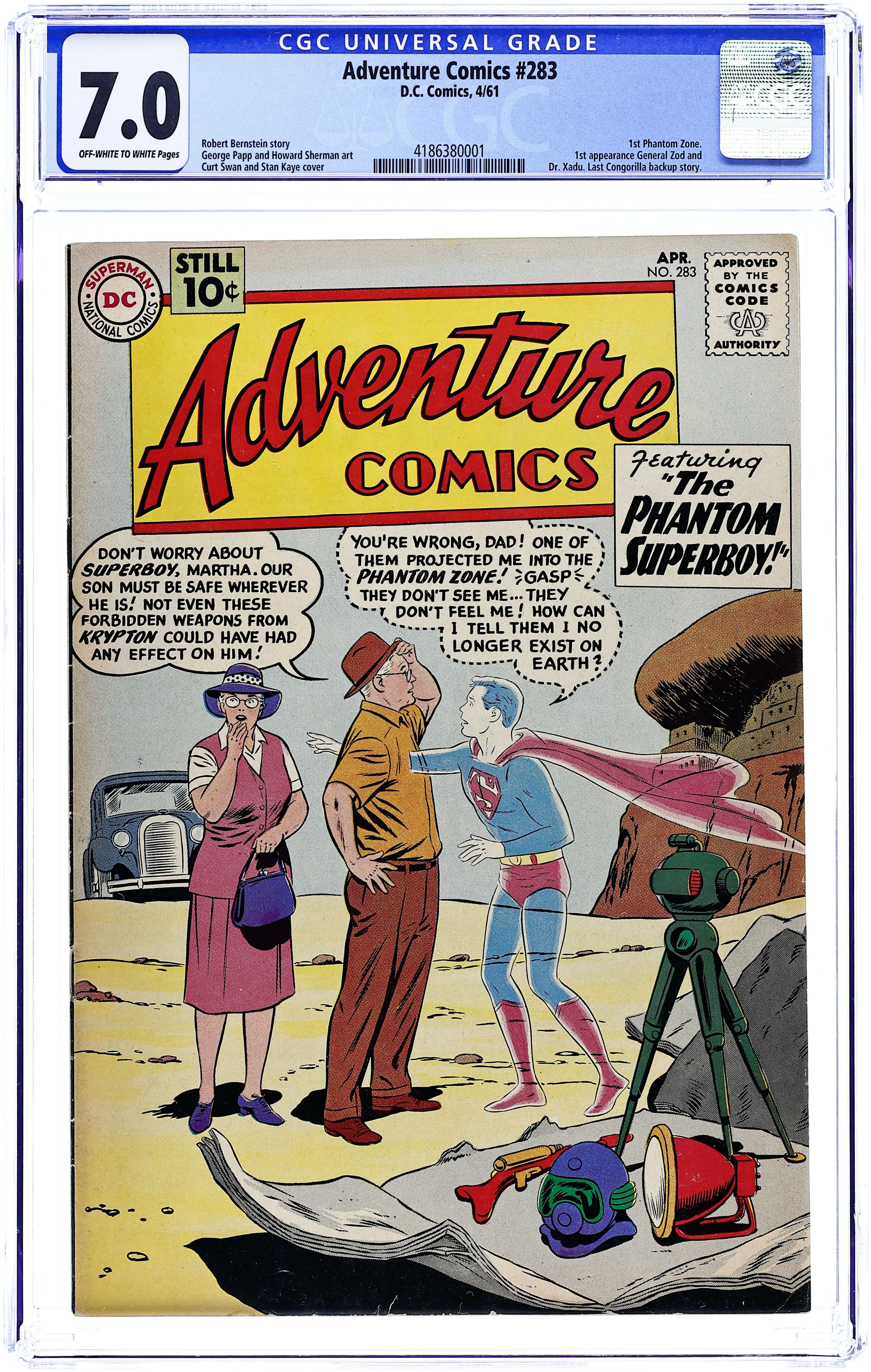 Cover pencils by Curt Swan, inks by Stan Kaye. 1st appearance of the Phantom Zone in The Phantom Superboy, script by Robert Bernstein, art by George Papp; After Professor Lang finds a box of Kryptonian weapons, Superboy is accidentally projected into the Phantom Zone, the place where Kryptonian criminals were exiled. A Salute to Our American Indians public service announcement, script by Jack Schiff, art by Bernard Baily. The Lion with the Double Identity starring Congorilla, script by Robert Bernstein, art by Howard Sherman. Little Pete humor page by Henry Boltinoff. 36 pages, Full Color. Cover price $0.10.