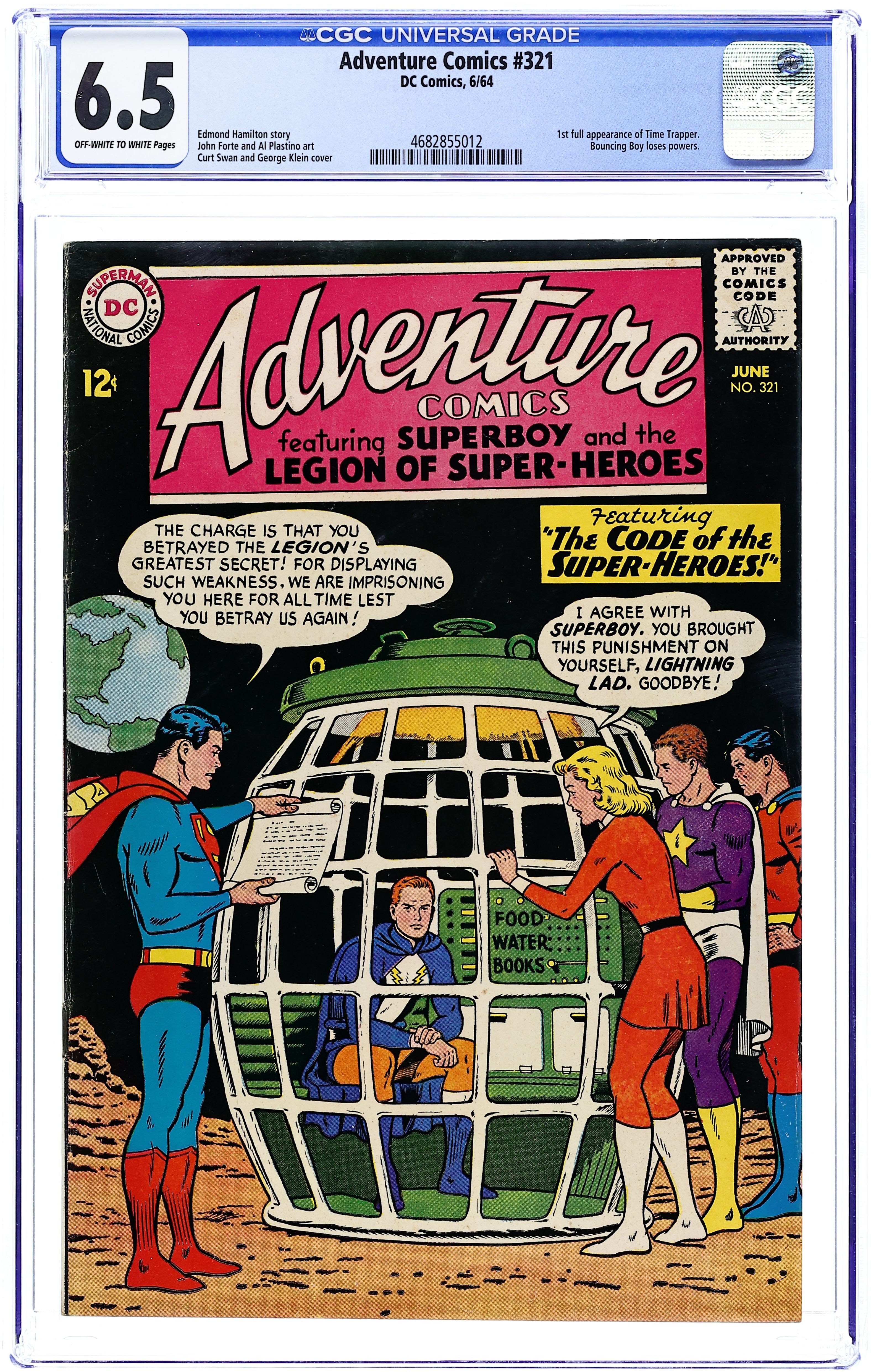 Cover pencils by Curt Swan, inks by George Klein. Part I: The Menace of Dream Girl!--Tales of the Legion of Super-Heroes, script by Edmond Hamilton, art by John Forte; Dream Girl joins the Legion and insists Lightning Lass be expelled when she loses her powers and demands Triplicate Girl be court-martialed for accusing her of causing Lightning Lass to lose her power. Super-Turtle humor page by Henry Boltinoff. Part II: The Doom of the Legion!--Tales of the Legion of Super-Heroes, script by Edmond Hamilton, art by John Forte; Even more Legionnaires are expelled before Dream Girl reveals to Star Boy that it was all a plot to prevent their deaths. In this two-parter, Lightning Lass becomes Light Lass, and the Hall of Fame series begins.The Shrinking of Superboy, art by John Sikela. 36 pages, Full Color. Cover price $0.12.