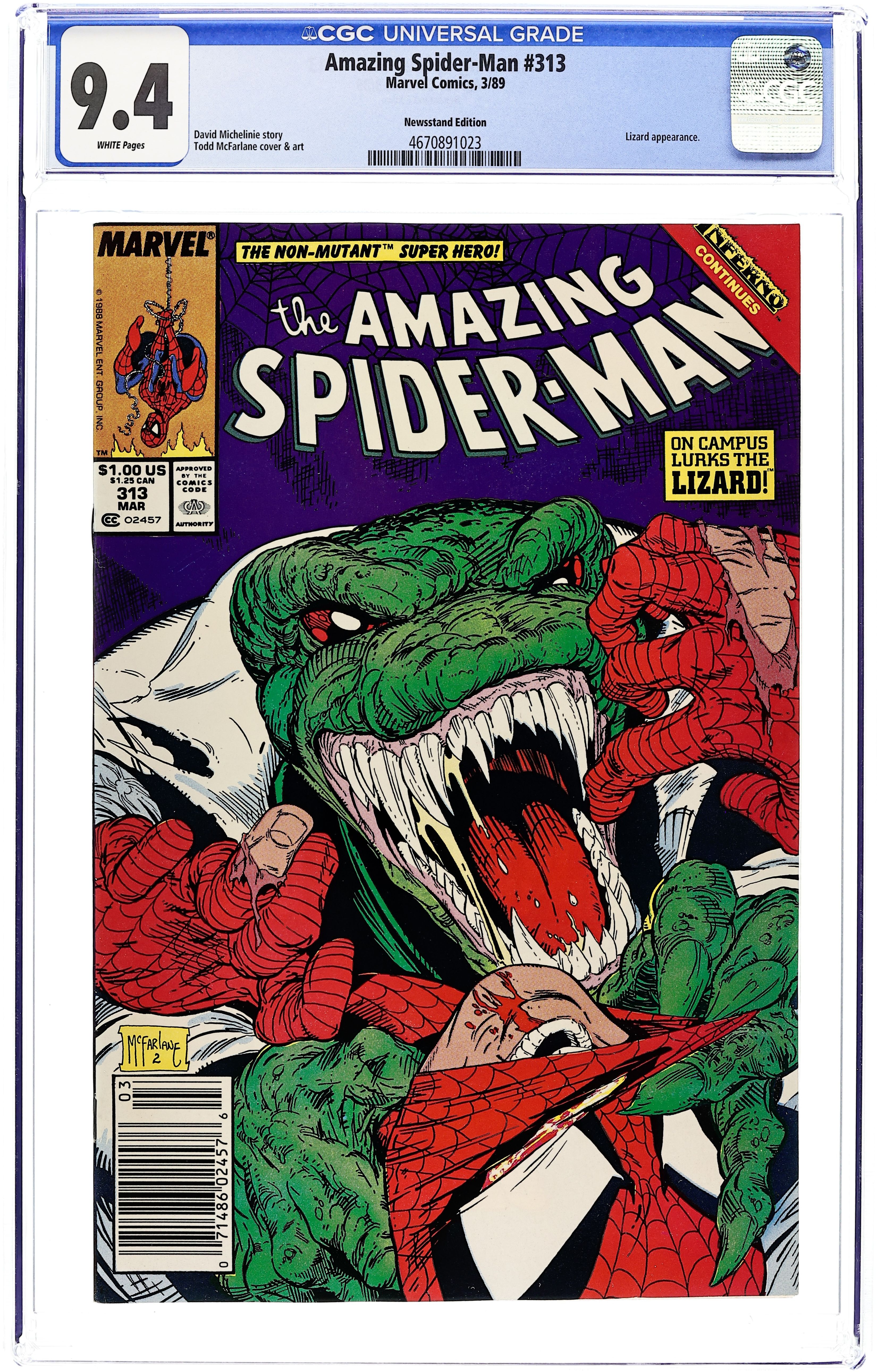 Ends Jan 15 7:32 PM CST Bid History 7 bids Current Bid $69 Your Secret Max Bid If you'd like to bid, please log in or register. Direct Edition. "Slithereens" Inferno crossover. Script by David Michelinie. Art by Todd McFarlane. Cover by Todd McFarlane. Story continues from Web of Spider-Man 48. Amid the rage of Inferno, Peter and Mary Jane rush to Queens to check on Aunt May! Fortunately she is okay. But back at Empire State University, Dr. Curt Connors is definitely not okay. In fact he has become the Lethal Lizard again! When Martha Connors and her son Billy stop by the ESU lab to check on Curt's welfare, the Lizard strikes! If the web-slinger can reach campus in time, he may be able to save Martha and Billy! But as far as saving the Lizard...sadly that time has long since past. Cameo appearance by Jonathon Caesar. (Note: The Lizard appears next in the first issue of the Spider-Man (1990) series.) 36 pages. Cover price $1.00.