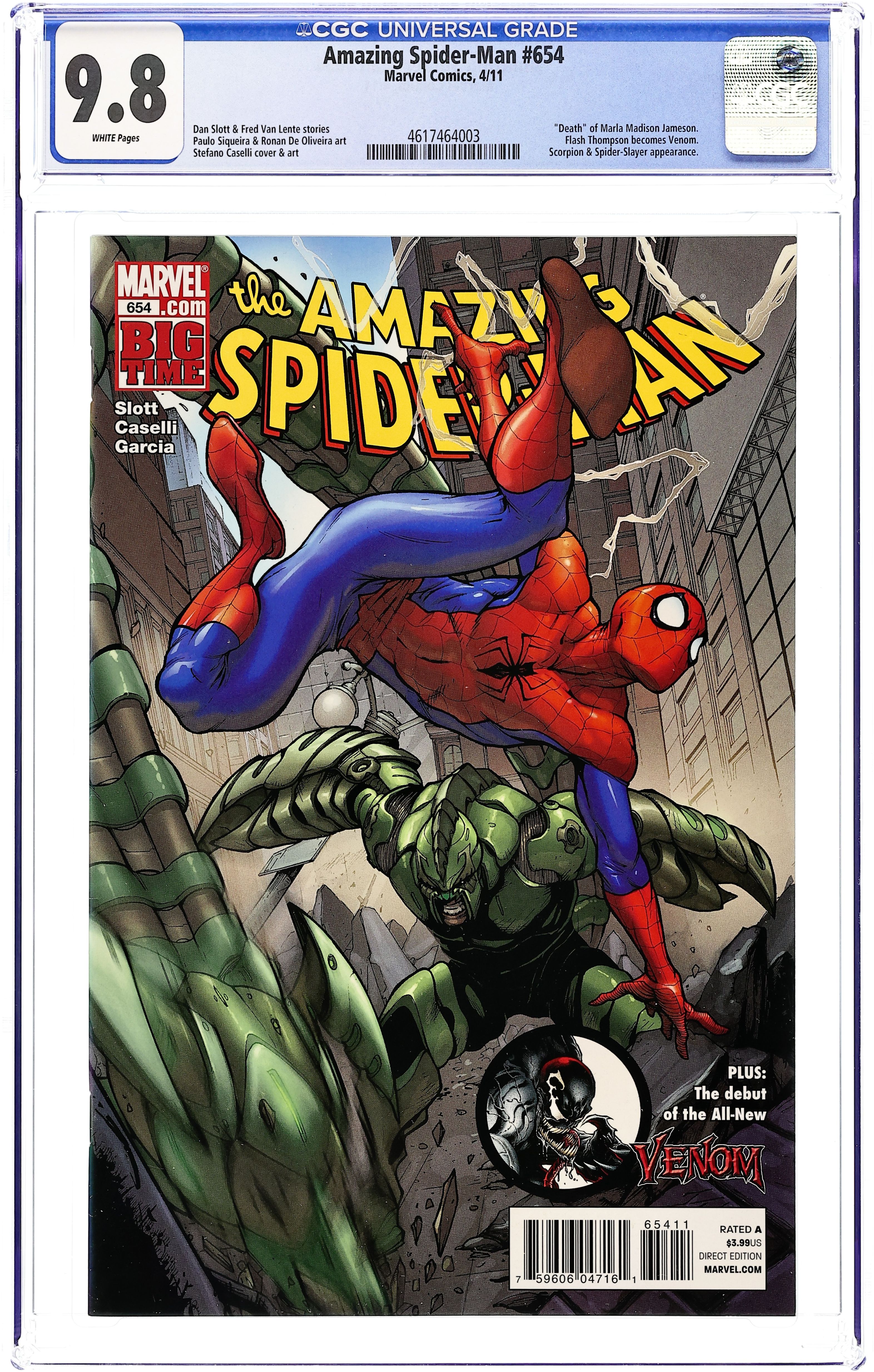 Starts Jan 3 Limited 1 for 25 Wraparound Variant Cover by MARCOS MARTIN. Big Time: Part 1 - Written by DAN SLOTT Pencils by HUMBERTO RAMOS BIG TIME BEGINS! Big changes are happening for the Amazing Spider-Man: Bigger threats, bigger guest-stars, and a big opportunity that could turn Peter Parker's life around! Which cast members are staying and who's saying goodbye? Find out as we're introduced to new characters and reintroduced to a number of Spidey villains as they make the triumphant return to the book! Plus: New developments for Mayor J. Jonah Jameson, the staff at Front Line, and The Sinister Six! The next chapter in Spider-Man history starts here! Guest starring THE AVENGERS and THE FANTASTIC FOUR in a giant-sized, 39 page lead feature! PLUS! An All-New Adventure featuring the All-New SPIDER-GIRL! PAUL TOBIN & CLAYTON HENRY bring a tale of action & intrigue, and make a strong argument for why you can sometimes send a Spider-GIRL to do a Spider-MAN's job... 60 pages/All-New Content/Rated A Cover price $3.99.