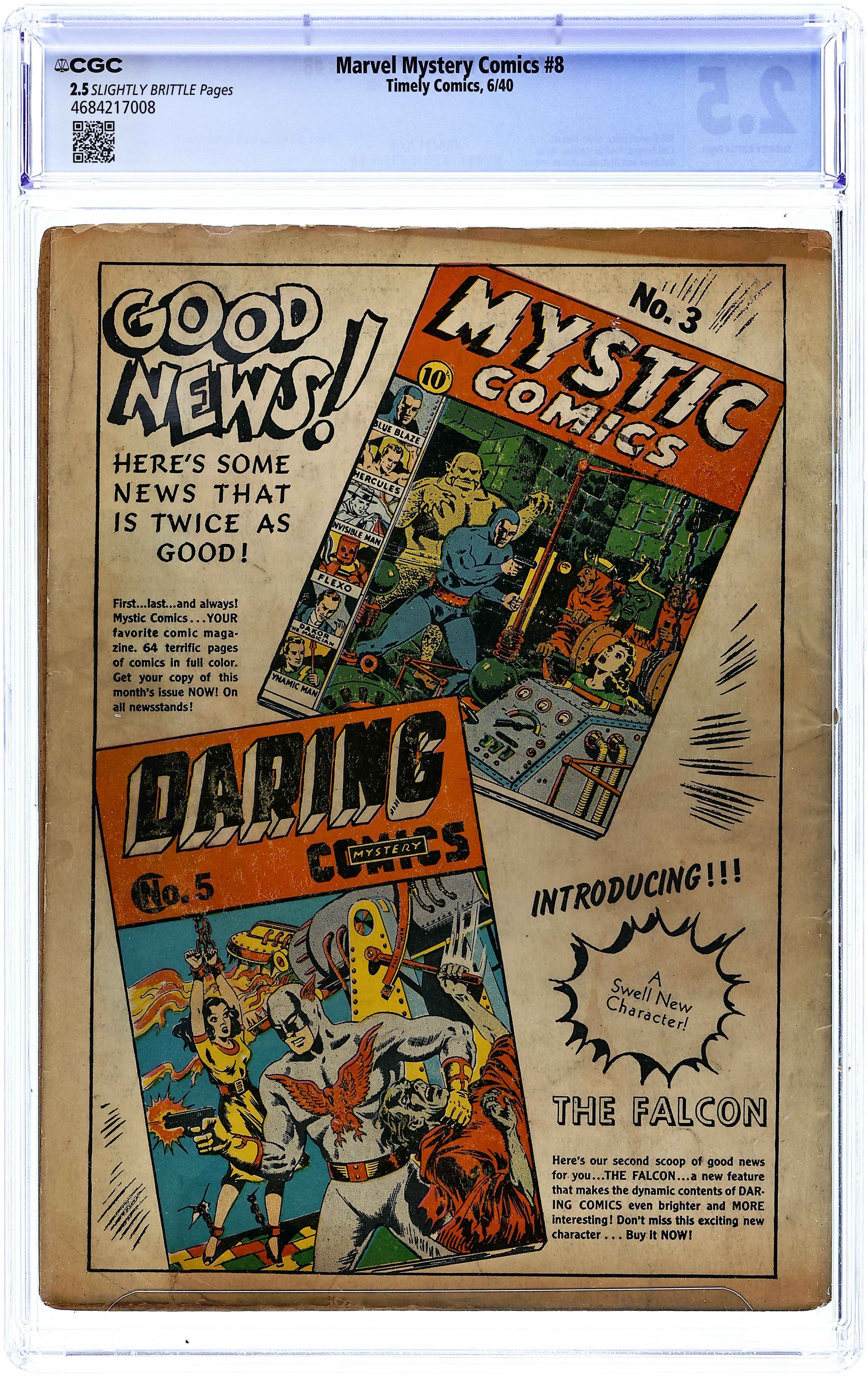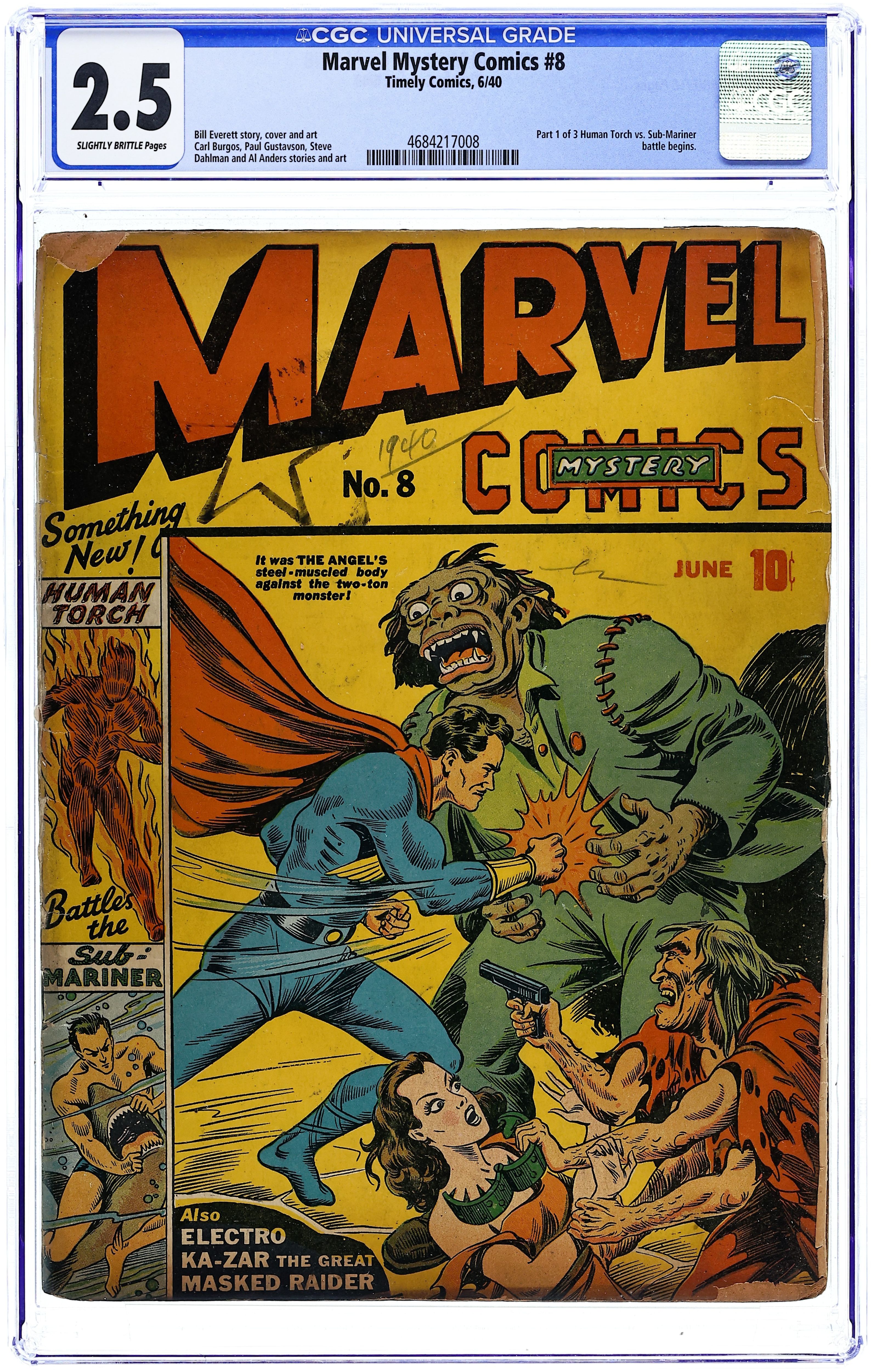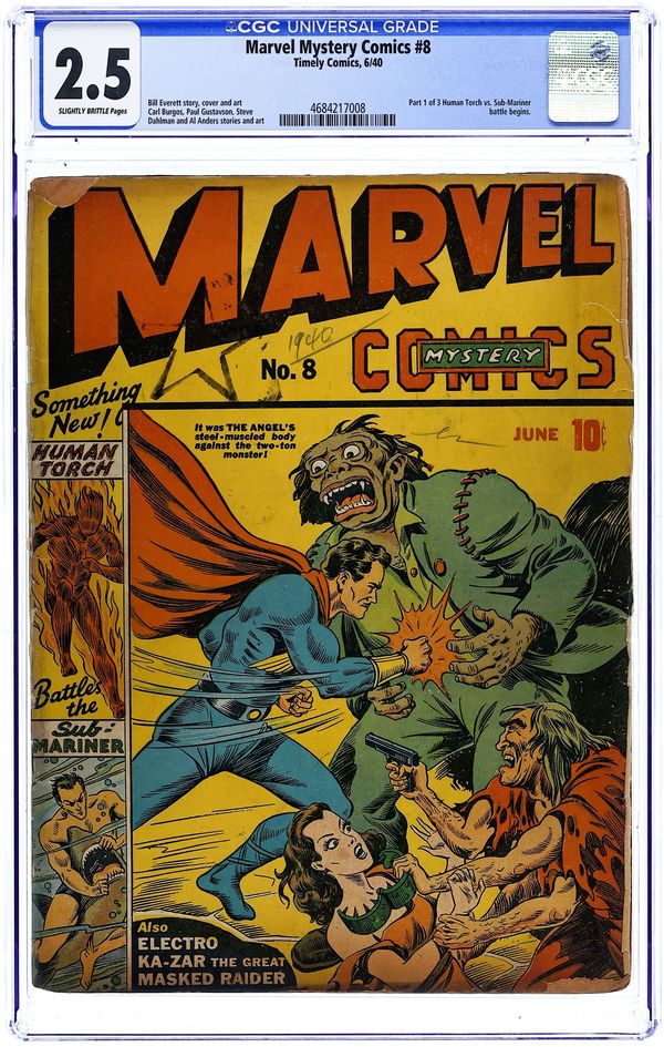 Cover art by Alex Schomburg. "The Human Torch and the Submariner Meet," script and art by Bill Everett; Namor looks for new ways to avenge himself on the mankind that attempted to electrocute him, but the Torch shows up and drives him away for the time-being. Human Torch untitled story, script and art by Carl Burgos; Embittered because the Police Chief believes Torch to be yellow because he failed to bring in the Sub-Mariner, the Torch races off to repair some of the damage Namor caused; He meets up with Betty and together they head for the Empire State Building where the Prince has been spotted. The Angel untitled story, art by Paul Gustavson; The Angel rescues a kidnapped girl in a cabin, supposedly held for ransom, and whose father owns the controlling stock in the Meltmore Steel Company. The Masked Raider untitled story, art by Al Anders; The Raider runs into Mexican Pete, who has attempted to trail the thieves who just robbed a local bank and made off with the savings of the small ranchers. Dynamite's Doom text story, script by Jack D'Arcy, art by Sam Gilman. Electro, the Marvel of the Age untitled story, art by Steve Dahlman; Keeping true to his word, "Boss" Sarpo escapes from prison, and with the help of "Scar-Face" Joe and his gang, kidnaps Professor Zog, killing his guards, kidnaps the DA, and uses Electro to begin a series of thefts. Ferret Mystery Detective untitled story, script by Stockbridge Winslow, art by Irwin Hasen; Ferret arrives at his bank to make a deposit just as it is being robbed, but he uses an unusual strategy, with himself as bait, to round up the crooks. Advenures of Ka-Zar the Great untitled story, art by Ben Thompson; Drake kills the man who has inherited a gold mine worth far more than he thought because he refuses to use the local natives as slave laborers. The local tribal chief enlists the aid of Ka-Zar to deal with the problem. Mystery and Daring Comics ad, art by Schomburg. 68 pages. Cover price $0.10.