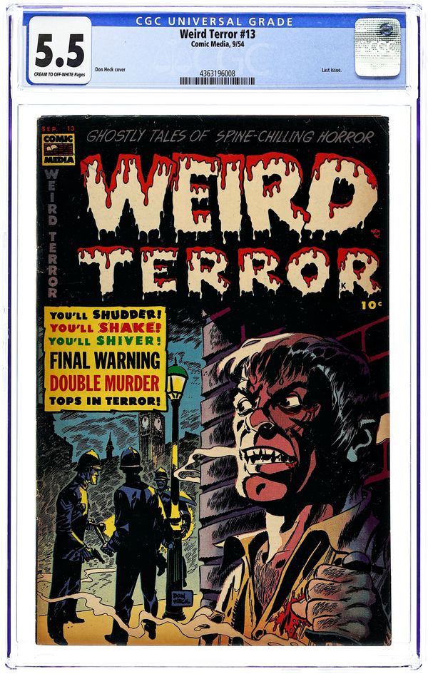 Cover by Don Heck. Stories and art by Max Elkin and others. Pre-Code horror comics by the talents at the Iger Shop. A lost explorer in Africa is rediscovered, and reveals the truth about shrunken heads. Jack the Ripper returns to London a century after his first killing spree. A jealous man plots the ruin of his romantic rival and when that doesn't work, settles for murder. Also featuring a cover by future Marvel legend Don Heck. Final Warning; Double Murder; Killing Spree; Dive to Death; How to Embalm a Corpse. Final issue of the series. 32 pages, Full Color. Cover price $0.10.