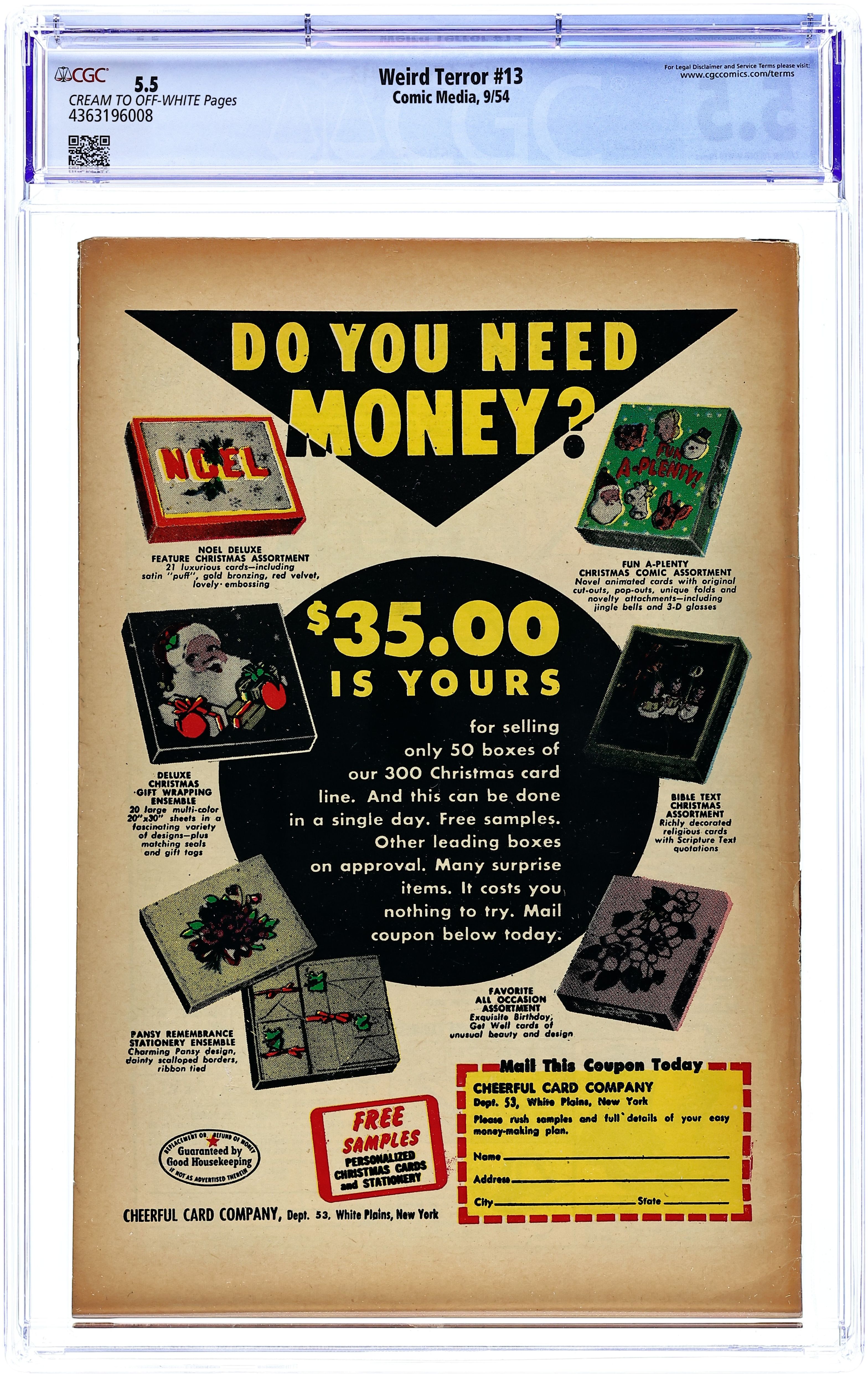 Cover by Johnny Craig. "Any Sport in a Storm," script by Carl Wessler, art by Johnny Craig; Lon made his way along the beach and past Smuggler's Caves as the stormy night raged on; He discovers that a story about a Sea Hag is true. "Coffin Spell!', script by Carl Wessler, art by Jack Davis; The two men finished digging up a corpse for Dr. Karolyi, but the man refused their efforts, so they went out to search for more bodies that the good doctor's students could use. "Pinch!" text story. E.C. Fan-Addict Club promo. "The Catacombs," script by Carl Wessler, art by Bernard Krigstein; Criminal Pietro plunges a knife into his greed partners back. "Out of Sight...", script by Carl Wessler, art by Graham Ingels; The circus barker encourages the crowd to pay to see the mental marvel of the age, the Great Brain, a man, once blindfolded, can identify any object being held up by his slow-witted partner, Benny. 36 pgs., full color. $0.10. Cover price $0.10.