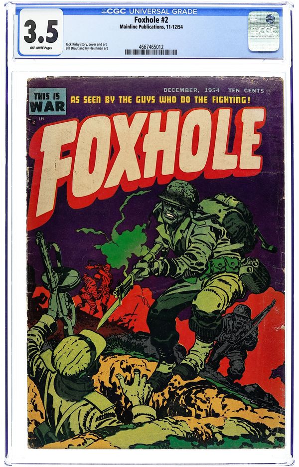 Cover by Jack Kirby. Stories and art by Jack Kirby, Hy Fleishman, and Bill Draut. Gritty war comics "produced by veterans" (as the tagline proclaims) from Mainline, the publisher founded by comics legends Joe Simon and Jack Kirby, creators of Captain America. In a suspenseful Kirby tale, a soldier slowly approaches a seemingly deserted Korean farmhouse. A Korean spy tries to lure American soldiers into a trap, but he makes one crucial mistake. Sarge and his men know they must fight their way out of the Hotbox. Booby Trap; Action; Walkie-Talkie; Hot Box; Dishonorable Discharge; Yellow; Replacement. 32 pages, Full Color. Cover price $0.10.
