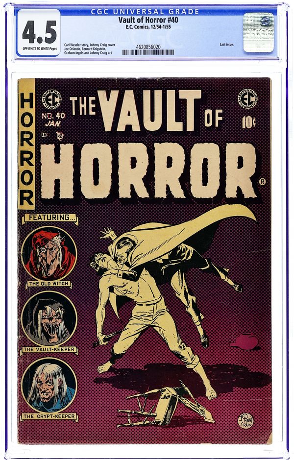 Final issue of the series. Cover by Johnny Craig. Ad for MAD magazine. "Old Man Mose!", script and art by Johnny Craig; Ned stopped his wagon when he saw townspeople throwing stones at old Mose, a man they thought worshipped the Devil since he lived in the Black Church. "An Harrow Escape!", script by Carl Wessler, art by Joe Orlando; Captain Grady's ship approached the seemingly derelict "Sea Witch", boarded her and found the entire group on board slaughtered. "The Pit!", script by Carl Wessler, art by Bernard Krigstein; Felix & Lila listened to the crowd screaming for blood as they watched a cock fight; Nearby, they was another fight brewing between vicious dogs. "Bloodsuckers" text story. "Ashes to Ashes!", art by Graham Ingels; Emil sat at his desk in the old Frankenstein mansion writing in his diary about how his infamous Father had tried to create life from a miasmic swamp. An editoral urges readers to write the Senate Subcommittee on Juvenile Delinquency, which had begun investigating the comics industry. 36 pgs., full color. $0.10. Cover price $0.10.
