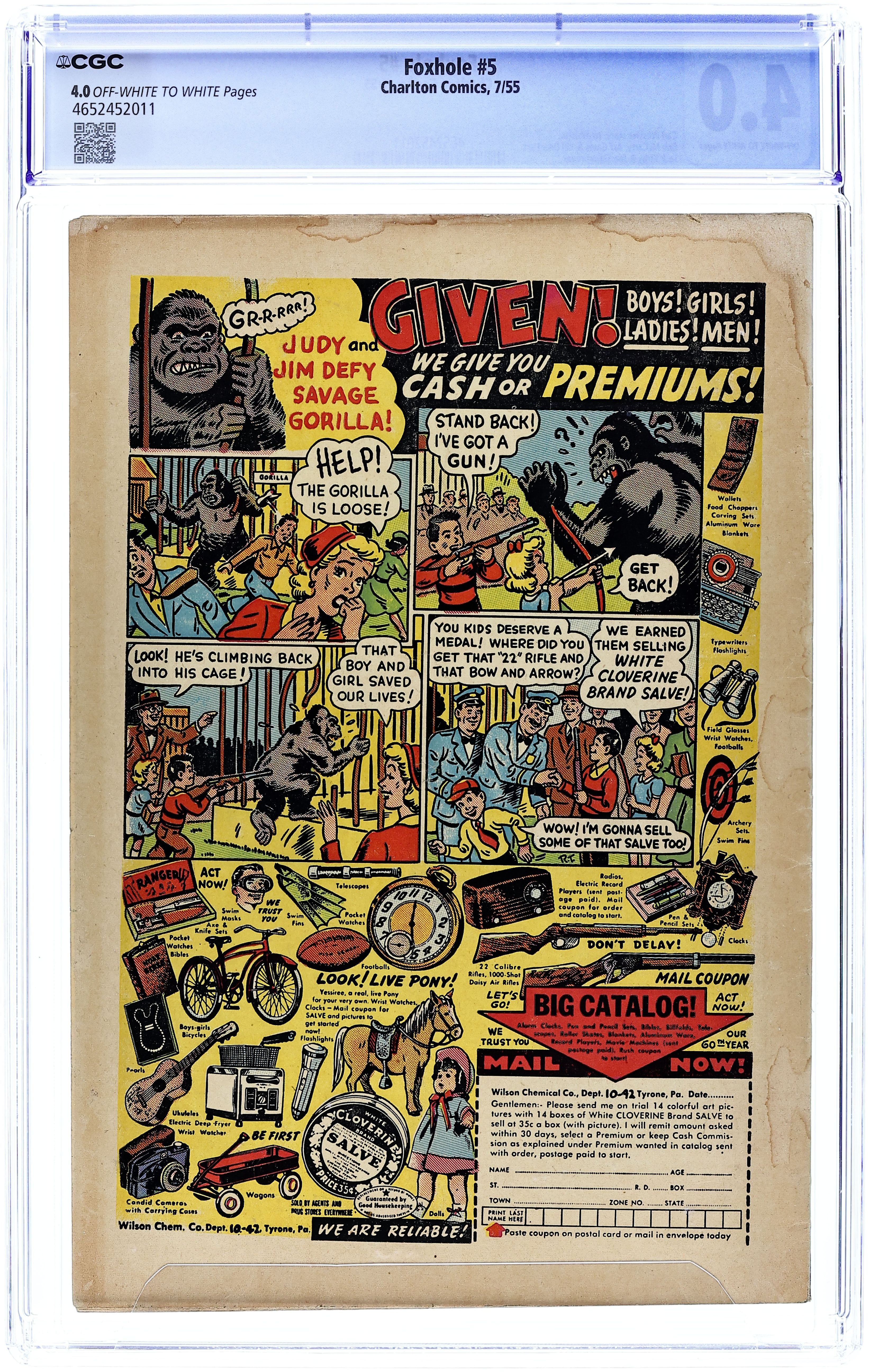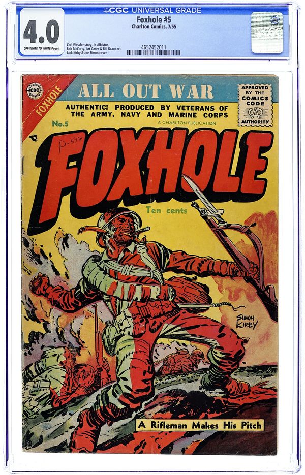 Cover by Jack Kirby. Stories and art by Jack Kirby, Carl Wessler, Jo Albistur, Bob McCarty, Art Gates, Bill Draut, Ted Galindo, and Jack Oleck. Charlton picks up the war series "produced by veterans," (as the tagline proclaims) created and originally published by comics legends Joe Simon and Jack Kirby. A soldier is lucky at cards and hopes his luck extends to the battlefield, in a story that may have been scripted by Jack Kirby. In an unusual story, a Kamikaze pilot flashes back on his life. A veteran WWII artillery specialist is disgusted with the task of launching propaganda leaflets in Korea. Glide Into Glory; Three Bagger; Soundin Off; Lucky Stiff; Kamikaze Joe; Masquerade; Fun in a Foxhole; "Hip Pockets" and the Paper Bullets; Morale!; Bell Bottom Bill. 32 pages, Full Color. Cover price $0.10.