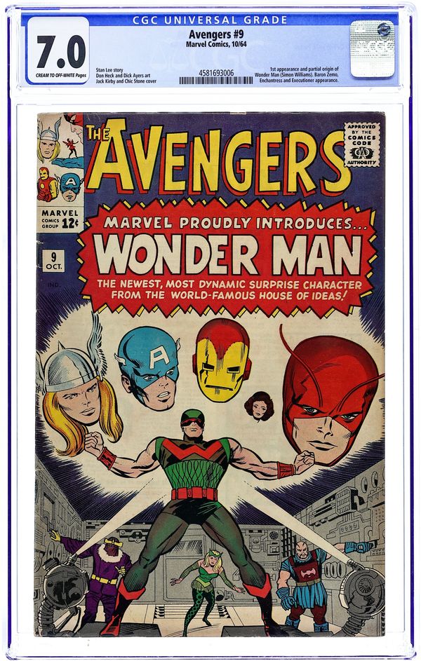 Ends Jan 13 7:55 PM CST Bid History 15 bids Current Bid $611 Your Secret Max Bid If you'd like to bid, please log in or register. Cover pencils by Jack Kirby, inks by Chic Stone. First appearance of Wonder Man in "The Coming of the... Wonder Man!", script by Stan Lee, pencils by Don Heck, inks by Dick Ayers; Baron Zemo and the Masters of Evil transform Simon Williams into Wonder Man and send him to infiltrate the Avengers; Instead, he winds up allying with them at the cost of his own life. Roster: Captain America, Thor, Iron Man, Giant-Man, and the Wasp. Villains: Executioner, the Enchantress, and Baron Zemo. Cameo appearance by Bucky. 36 pgs., full color. $0.12. Cover price $0.12.
