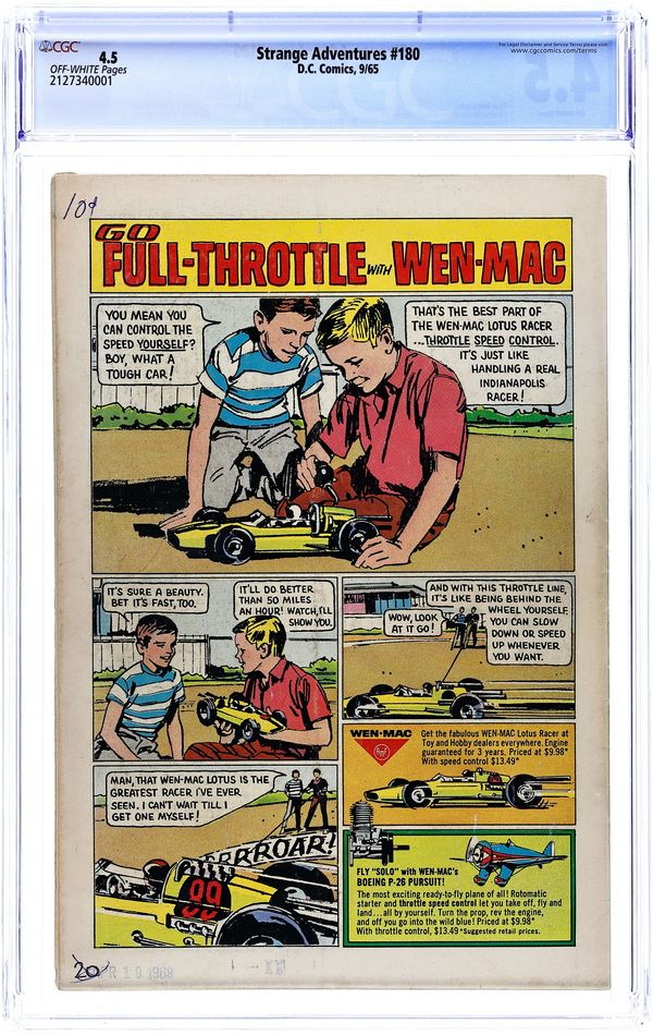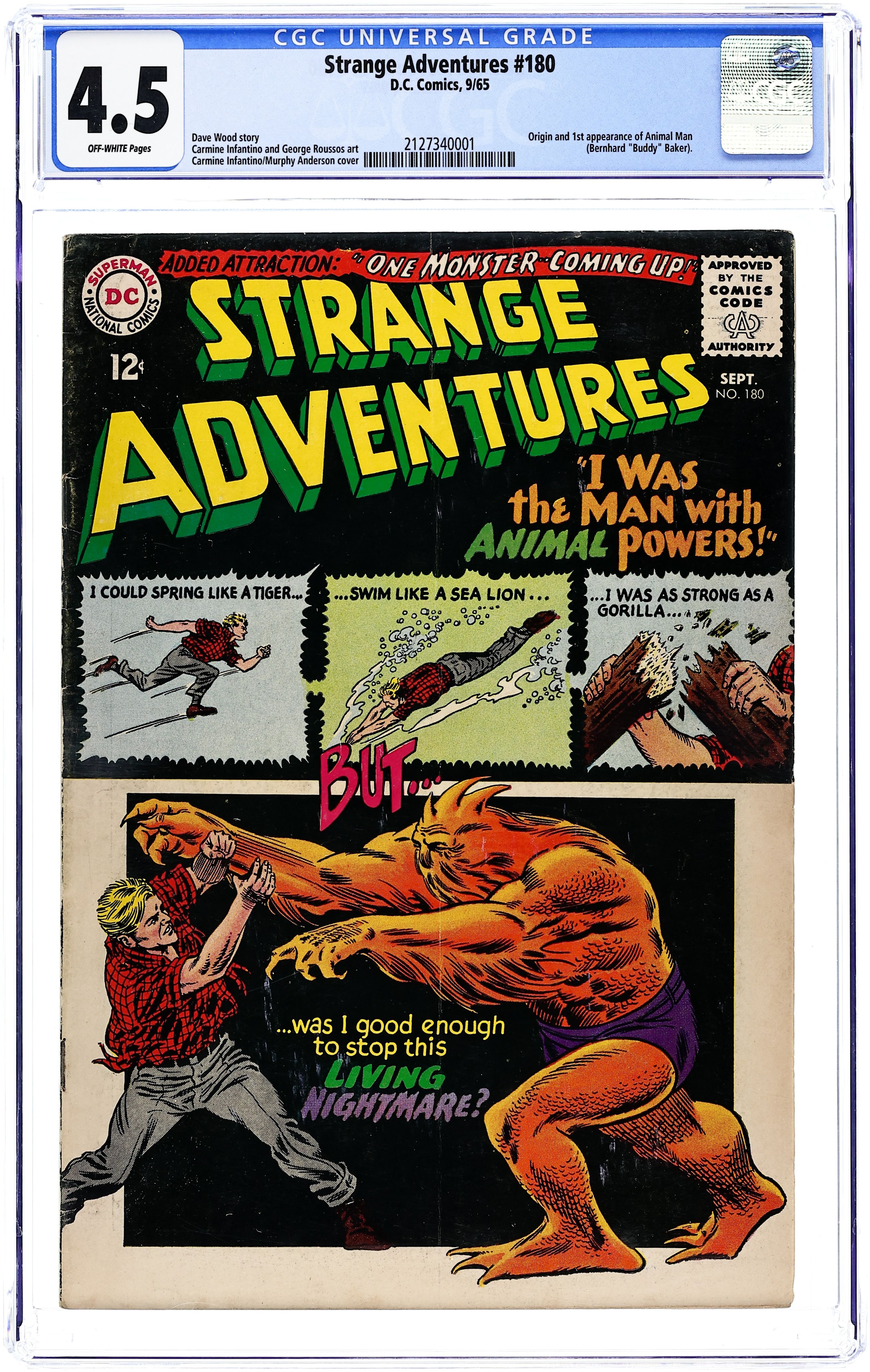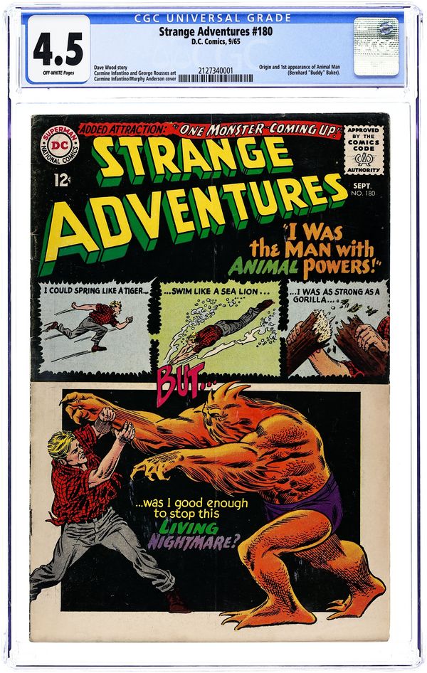 1st appearance and origin of Animal Man in "I Was the Man With Animal Powers" (pencils by Carmine Infantino); and "One Monster, Coming Up." Infantino/Murphy Anderson cover.Carmine Infantino cover. Carmine Infantino & George Roussos art. 36 Pages, Full Color. Cover price $0.12.
