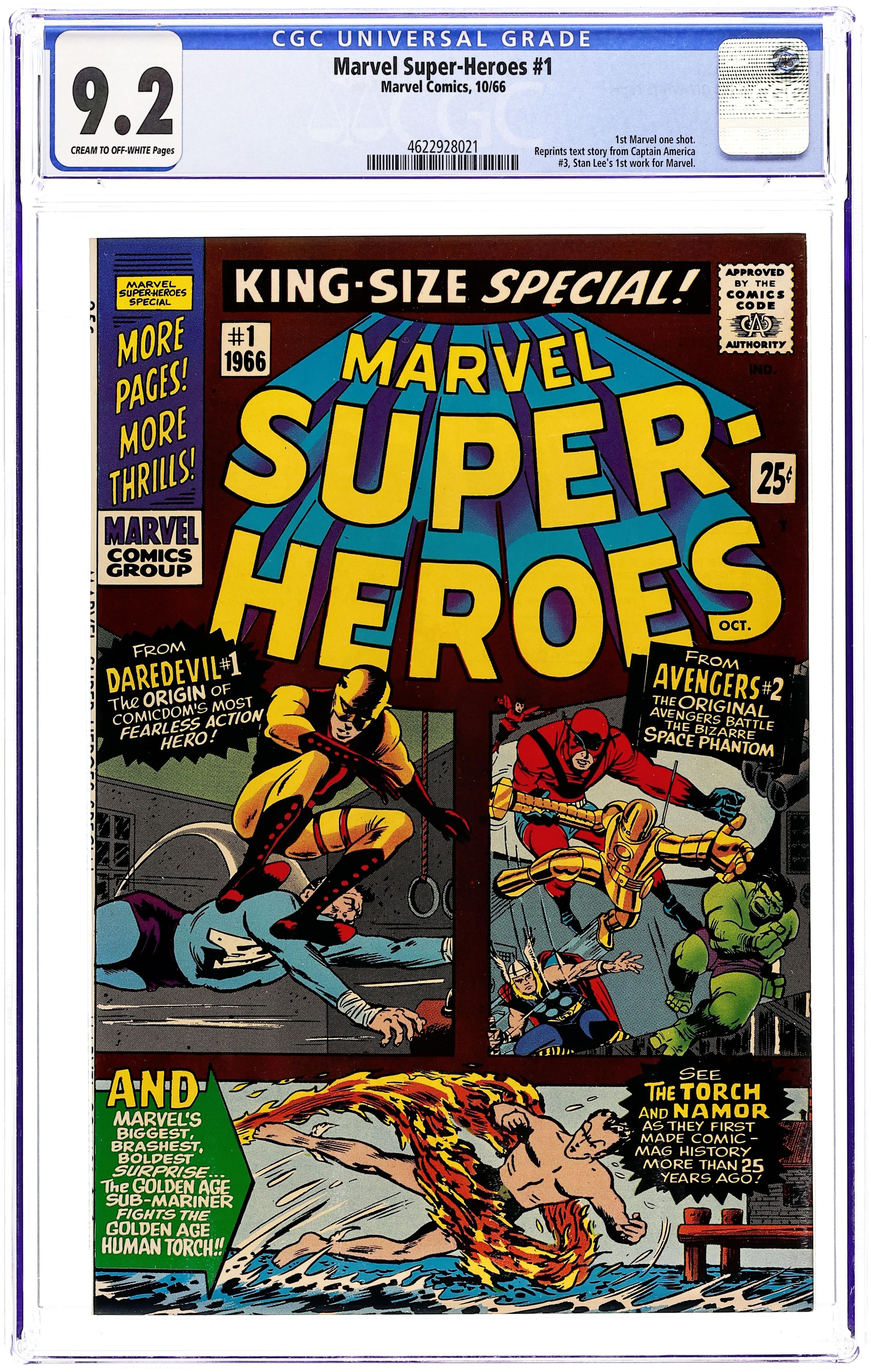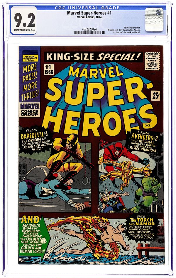 1st Marvel one-shot. Giant-size special. All reprints: "The Avengers Battle the Space Phantom" (script by Stan Lee, pencils by Jack Kirby, inks by Paul Reinman from Avengers 2 in 1963); "The Origin of Daredevil" (script by Lee, art by Bill Everett from Daredevil 1 in 1964); a Golden Age story, "The Human Torch and the Sub-Mariner Meet" (from Marvel Mystery Comics 8 in 1940); and a two-page text story, "Captain America Foils the Traitor's Revenge" (Stan Lee's first story for Marvel from Captain America 3 in 1941). Cover price $0.25.