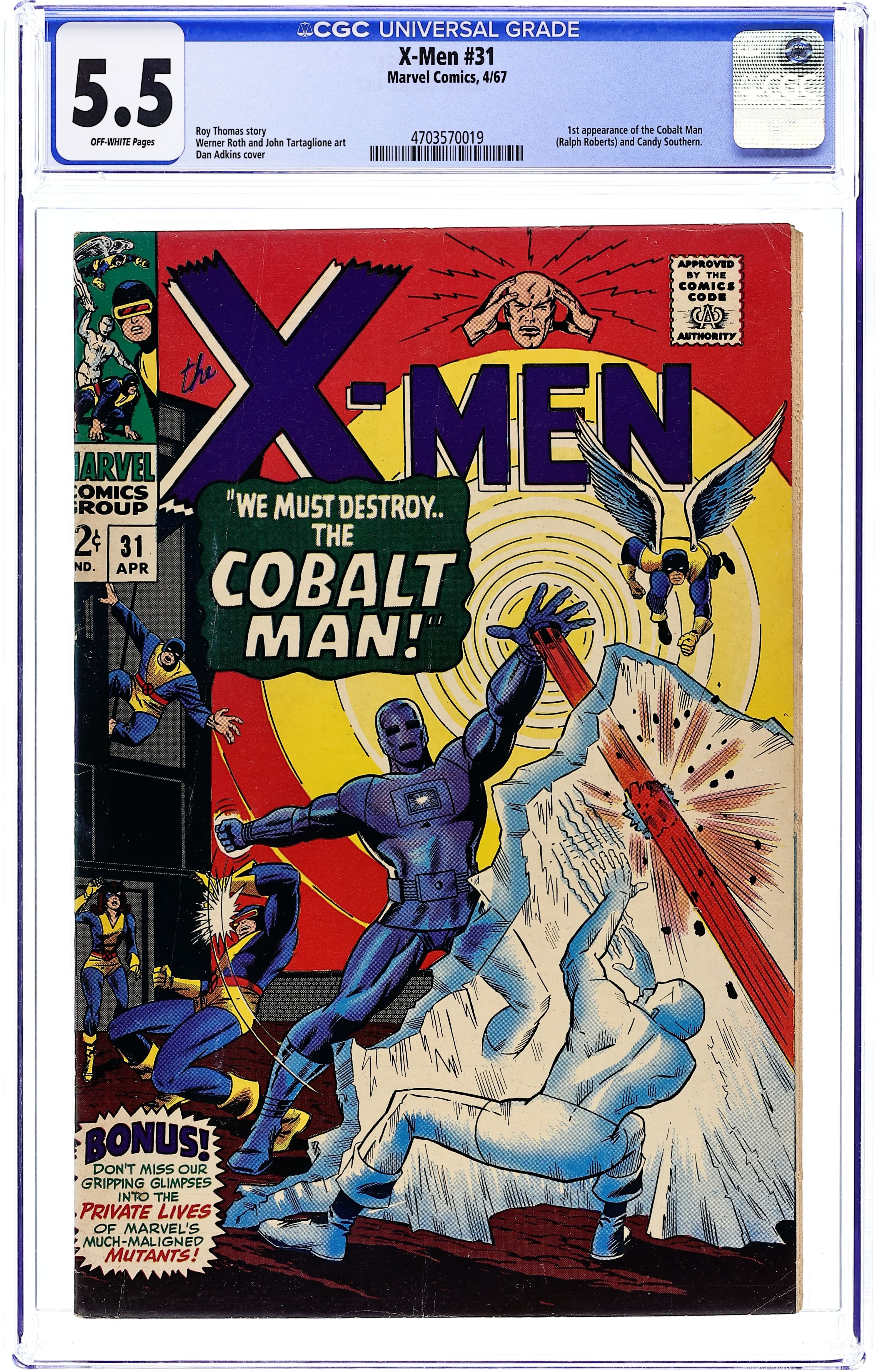 Cover art by Dan Adkins. We Must Destroy...the Cobalt Man!, script by Roy Thomas, pencils by Werner Roth, inks by John Tartaglione; The X-Men are given a weekend off and head out for some fun; Cyke and Angel visit Jean in college and find her engaged with brothers Ted and Ralph Roberts; Ralph, who used to work for Tony Stark, takes them all to his lab where he puts on his new Cobalt Man suit to impress his brother; Going a little batty, Cobalt Man wrecks the lab and heads out to Stark Industries to confront his old boss; The X-Men assemble to battle him before his suit becomes radioactive and blows up; Iron Man and Juggernaut cameos.. 36 pgs. $0.12. Cover price $0.12.