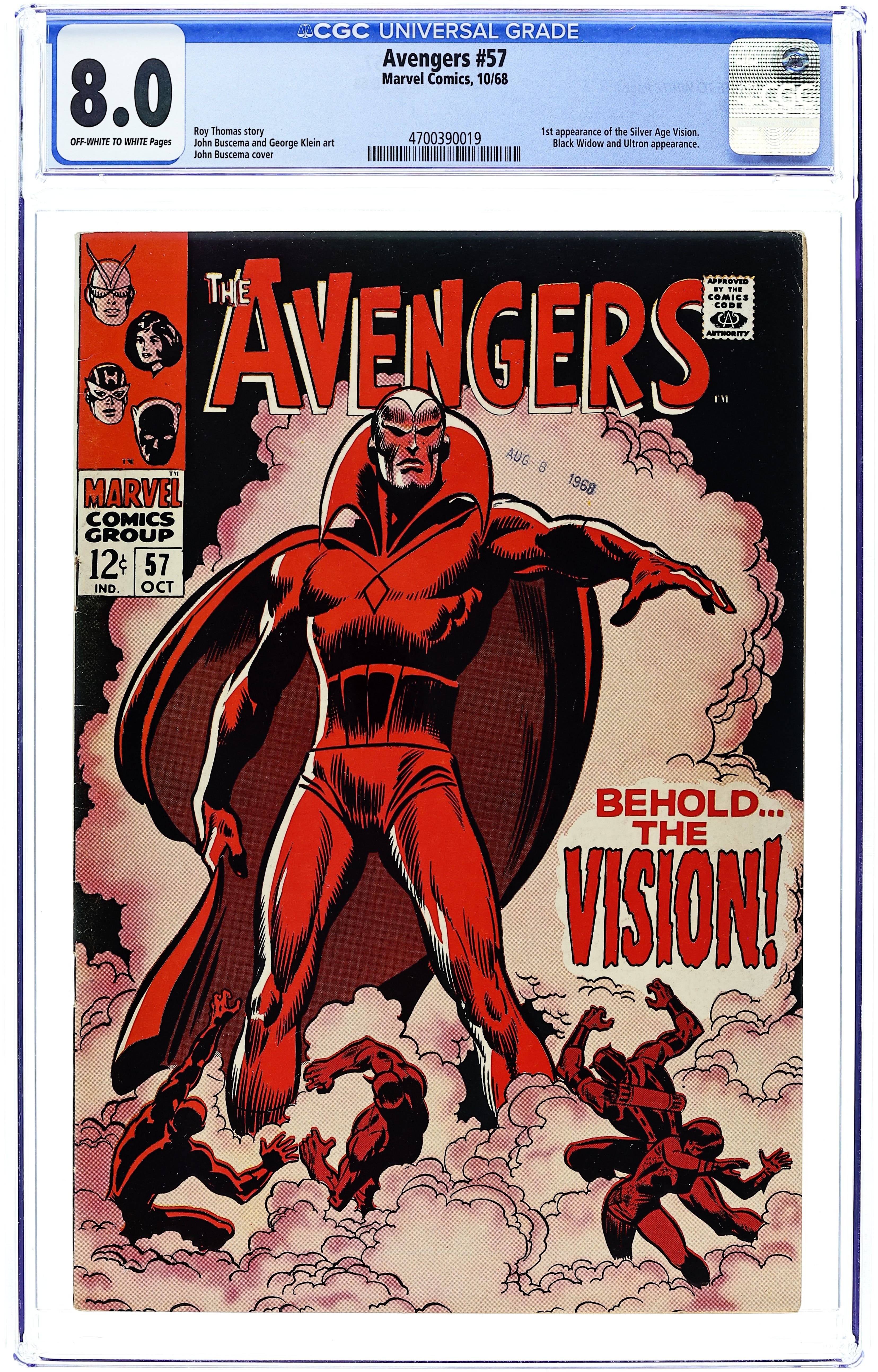 First appearance of the Vision in "Behold...the Vision!" Part 1 of 2. Script by Roy Thomas. Pencils by John Buscema. Inks by George Klein. Cover by John Buscema and George Klein. One of the landmark issues of the silver age! On a rainy night in Manhattan, a strange being enters Janet Van Dyne's apartment and suddenly collapses! The Wasp quickly calls Goliath; and they take the red-hued stranger to Avengers Mansion for examination! Once their Hank Pym discovers that the Vision is a human being constructed of synthetic materials - a synthezoid in fact! When the Vision wakes up, he remembers that Ultron sent him to destroy the Avengers! But now the Vision wants to flip the script on his creator! So he leads Earth's Mightiest Heroes back to Ultron's underground lair! Could this be a trap? Either way Ultron-5 is waiting! And the battle is coming! Will the Vision prove worthy of the Avengers' trust? Cameo appearance by the Black Widow. Avengers Lineup: Black Panther, Goliath, Hawkeye, and the Wasp. (Notes: The synthezoid avenger is not to be confused with the golden age Vision (aka Aarkus). Marie Severin contributed pencils to page 3 - the second to last panel. The letters page includes a letter from comics writer Tony Isabella. This issue was reprinted in Marvel Treasury Edition (1974) #7 and also in Marvel Super Action #18.) 36 pages. Cover price $0.12.