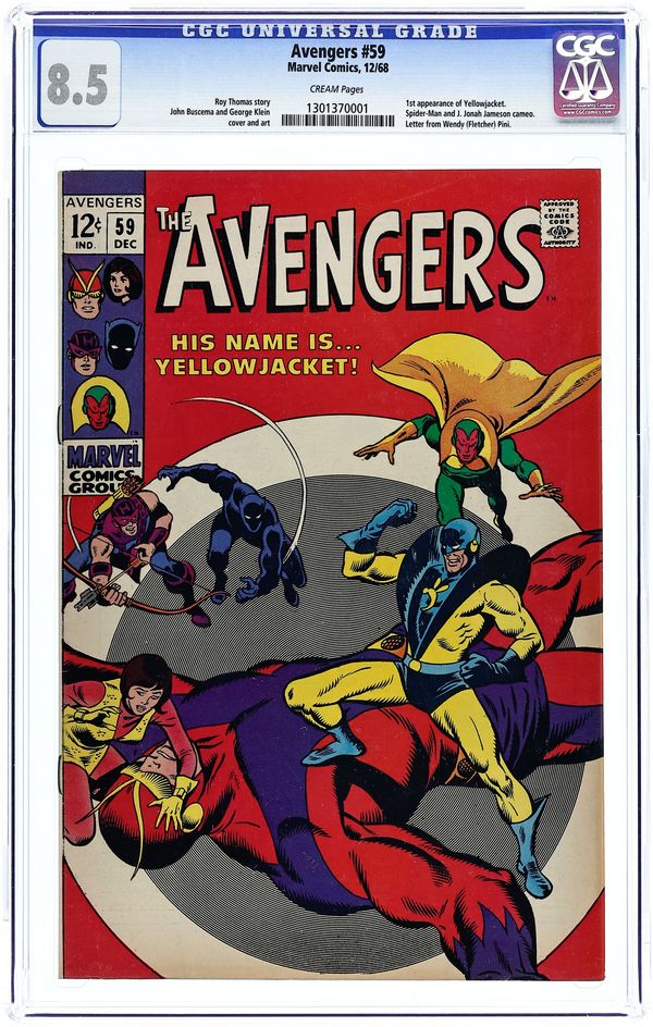 First appearance of Yellowjacket (aka Henry Pym) in "The Name is Yellowjacket!" Part 1 of 2. Script by Roy Thomas. Pencils by John Buscema. Inks by George Klein. Cover by John Buscema and George Klein. A new crime-fighter bursts onto the scene in New York City! And the Daily Bugle loves him already! The brash Yellowjacket barges into Avengers Mansion and boasts about killing Goliath! Shocked by the news; Hawkeye, T'Challa, and the Vision charge forward! But the mysterious Yellowjacket fights them off and absconds with the Wasp! Fearing that Jan is in serious danger, the Avengers pursue Yellowjacket across town! But when Earth's Mightiest Heroes locate their new foe, the Wasp asks them to leave Yellowjacket alone! Wow, why would Jan do that? Because she wants to marry him that's why! Wedding bells ring next issue! Cameo appearances by J. Jonah Jameson, Spider-Man, Jarvis, Nick Fury, Dum Dum Dugan, and the Black Widow. Avengers Lineup: Black Panther, Hawkeye, Wasp, Yellowjacket, and the Vision. (Notes: The letters page includes a letter from Elfquest co-creator Wendy Fletcher (Pini). This two-part story was reprinted in Marvel Super Action 20 & 21.) 36 pages. 12 cent cover price. Cover price $0.12.