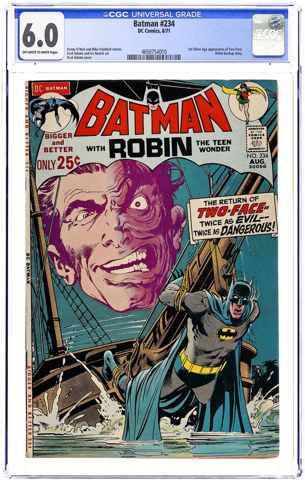 Batman stars in the story "Half an Evil" which is the first appearance of the Silver-Age Two Face. Script by Denny O' Neil, pencils by Neal Adams, inks by Dick Giordano. Robin stars in the story "Vengeance for a Cop." Script by Mike Friedrich, pencils by Irv Novick, inks by Giordano. Reprint: 1964 story "Trail of the Talking Mask" which introduces the "new look" for Batman, symbolized by the addition of an oval around the bat-insignia. Script by Gardner Fox, pencils by Carmine Infantino, and inks by Joe Giella. Letter to the editor from comics writer Bob Rozakis (misspelled "Razakis"). Adams cover. 52 Pages, Full Color. Cover price $0.25.
