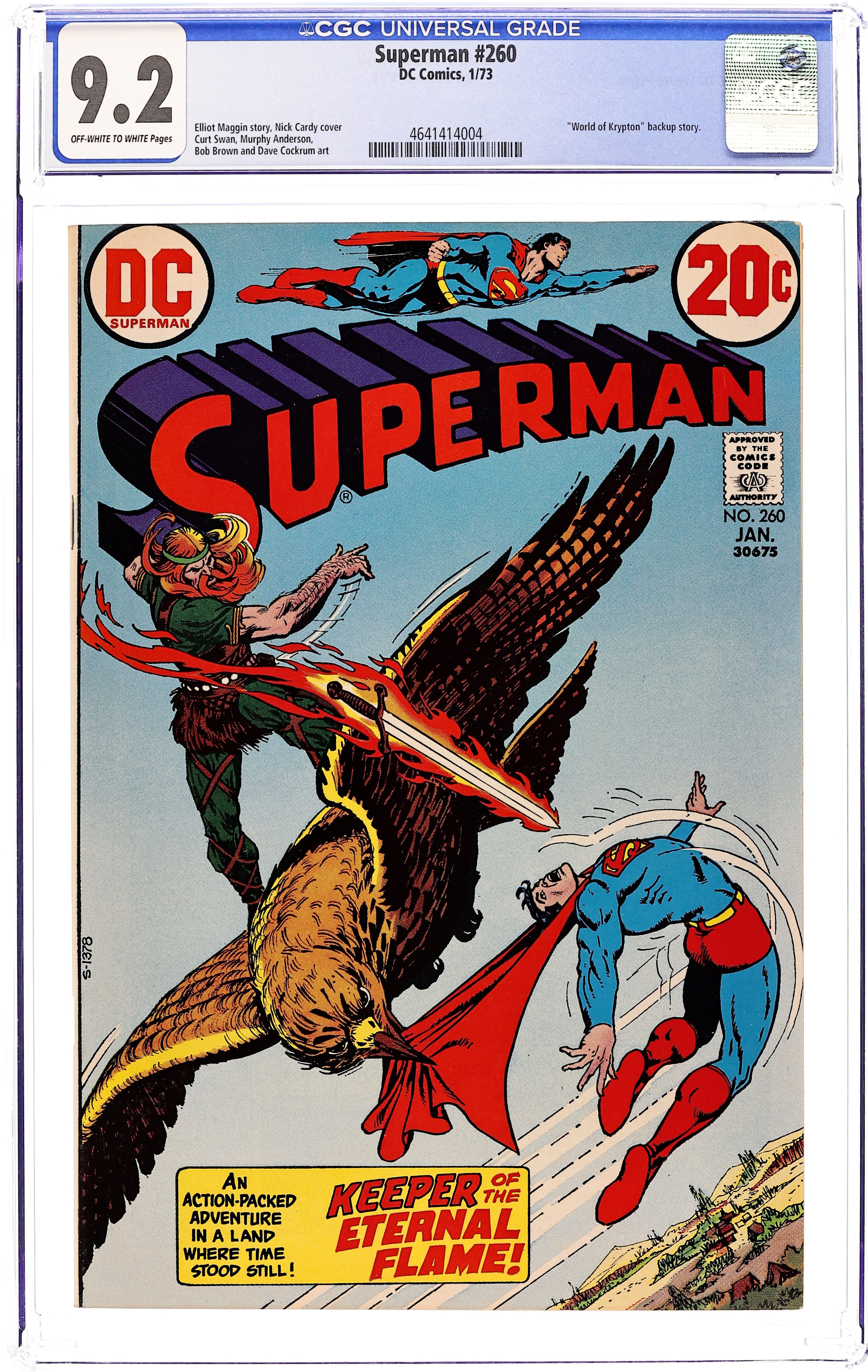 Cover art by Nick Cardy. Keeper of the Eternal Flame!, script by Elliot S! Maggin, pencils by Curt Swan, inks by Murphy Anderson; in a hidden valley of Vikings, Superman finds Valdemar, a hero who rides a huge bird and wields a flaming sword. Let My People Live!--The Fabulous World of Krypton, script by Elliot S! Maggin, pencils by Bob Brown, inks by Dave Cockrum; two tribes on Krypton pick a champion to battle one another. A letter from Bob Rozakis. 36 Pages, Full Color. Cover price $0.20.