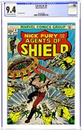This series contains slightly edited reprints. Cover art by Jim Steranko. The Power of SHIELD!, script by Jack Kirby (plot) and Stan Lee (dialogue), pencils by Jack Kirby (layout) and Jim Steranko, inks by Jim Steranko; Fury finds a way to signal SHIELD without a radio, delaying disaster; But after Sitwell realizes Fury is the pilot, he still orders the launching of a "Strato-Mine", which could ignite the very atmosphere; Supreme Hydra gets news that Laura Brown-- the daughter of his predecessor, who turned traitor and helped Fury a year before-- has been captured in Egypt. The Hiding Place!, script by Jack Kirby (plot) and Roy Thomas (dialogue), pencils by Jack Kirby (layouts) and Jim Steranko, inks by Jim Steranko; While enjoying a shave, Fury thinks back on SHIELD's 1st battle with HYDRA, when Laura Brown-- who had joined only to convince her father to give up his mad dream of world conquest-- saved his life and helped defeat them; As the President pushes thru a pardon for her, she's being transported by Gabe & Jasper-- whose car is attacked by HYDRA. 36 pgs. $0.20. Cover price $0.20.