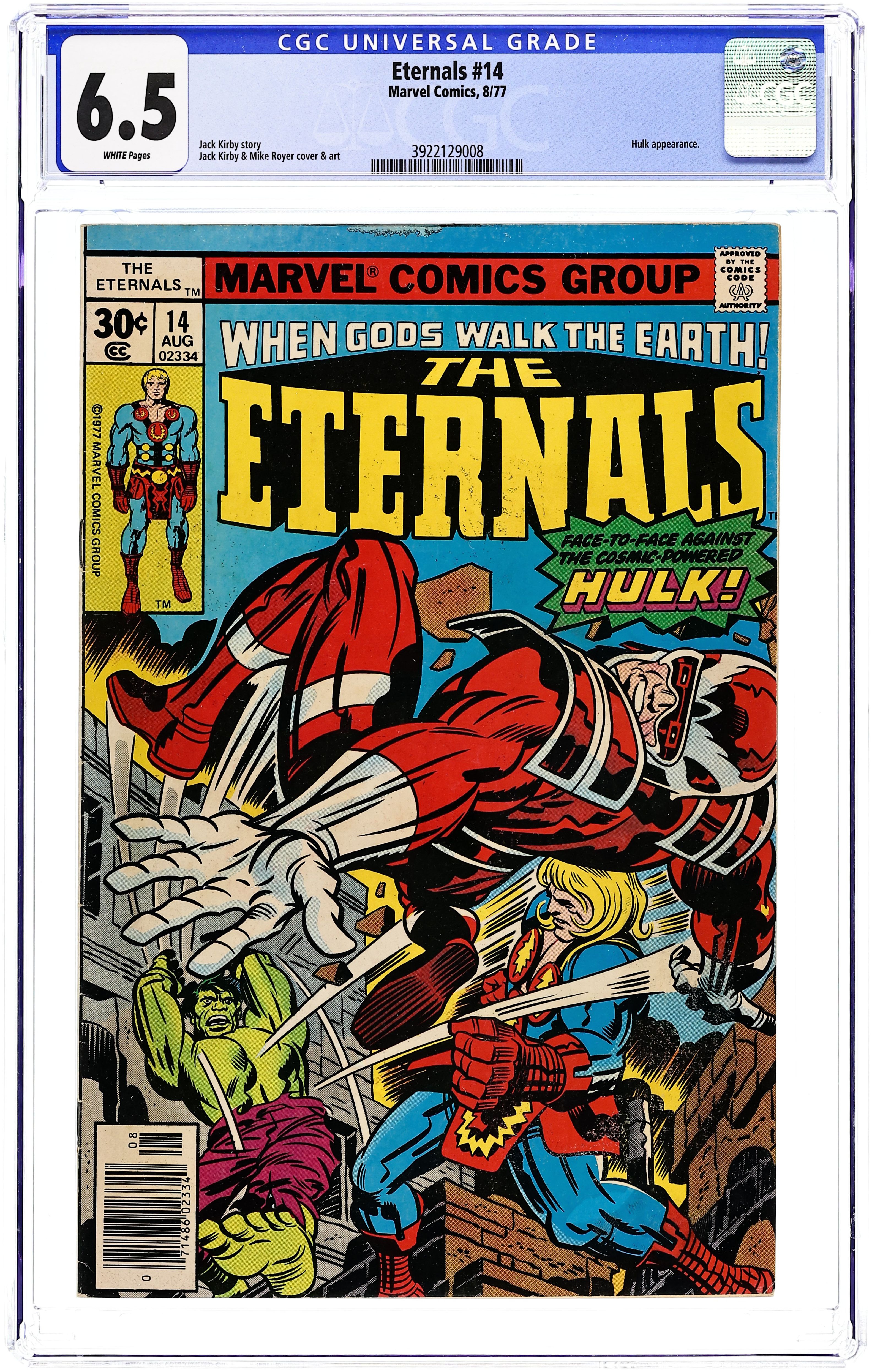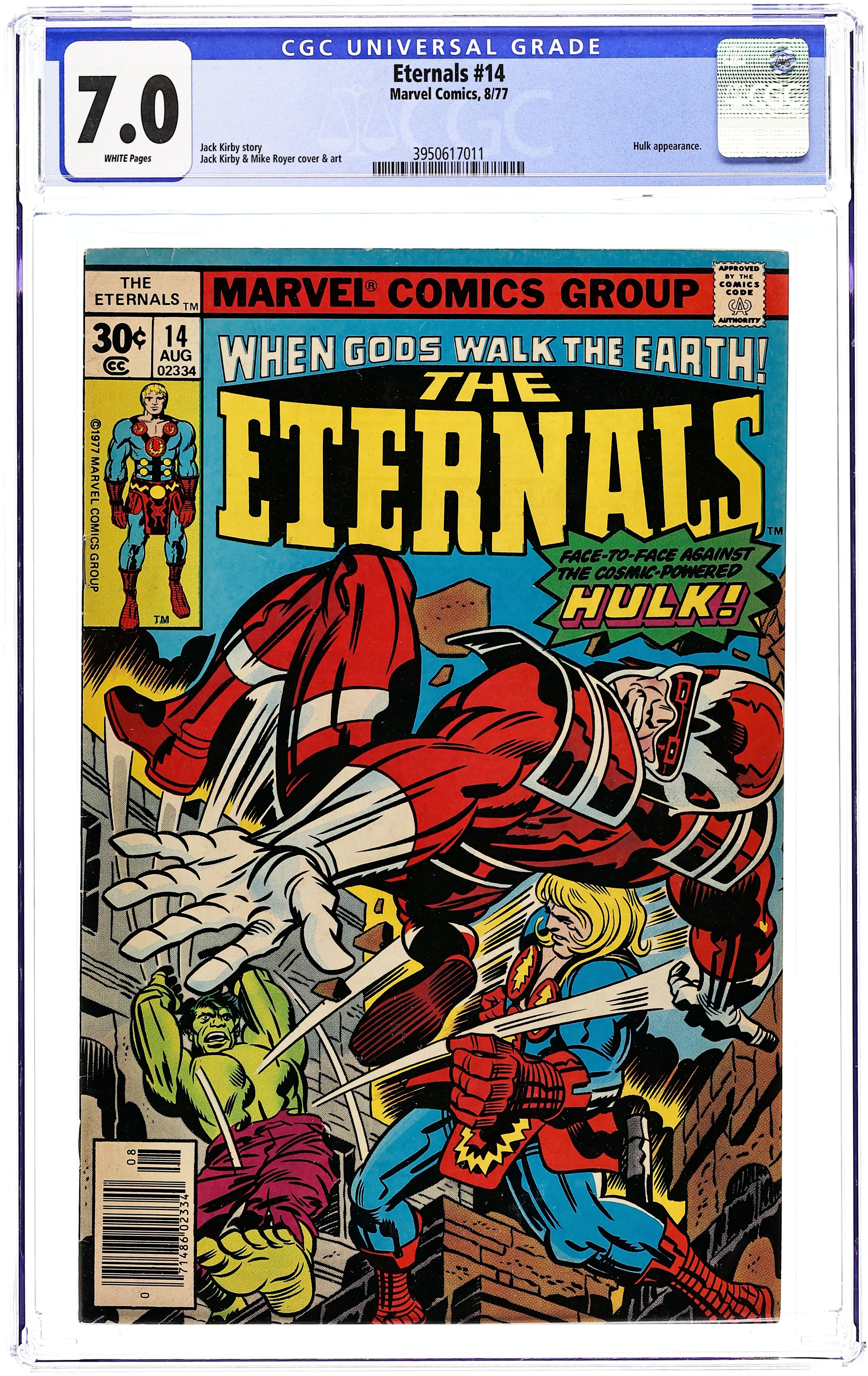 "Ikaris and the Cosmic-Powered Hulk." Written by Jack Kirby. Pencils by Jack Kirby. Inks by Mike Royer. Can even an immortal withstand the awesome power of the Cosmic Hulk?! Cover price $0.30.