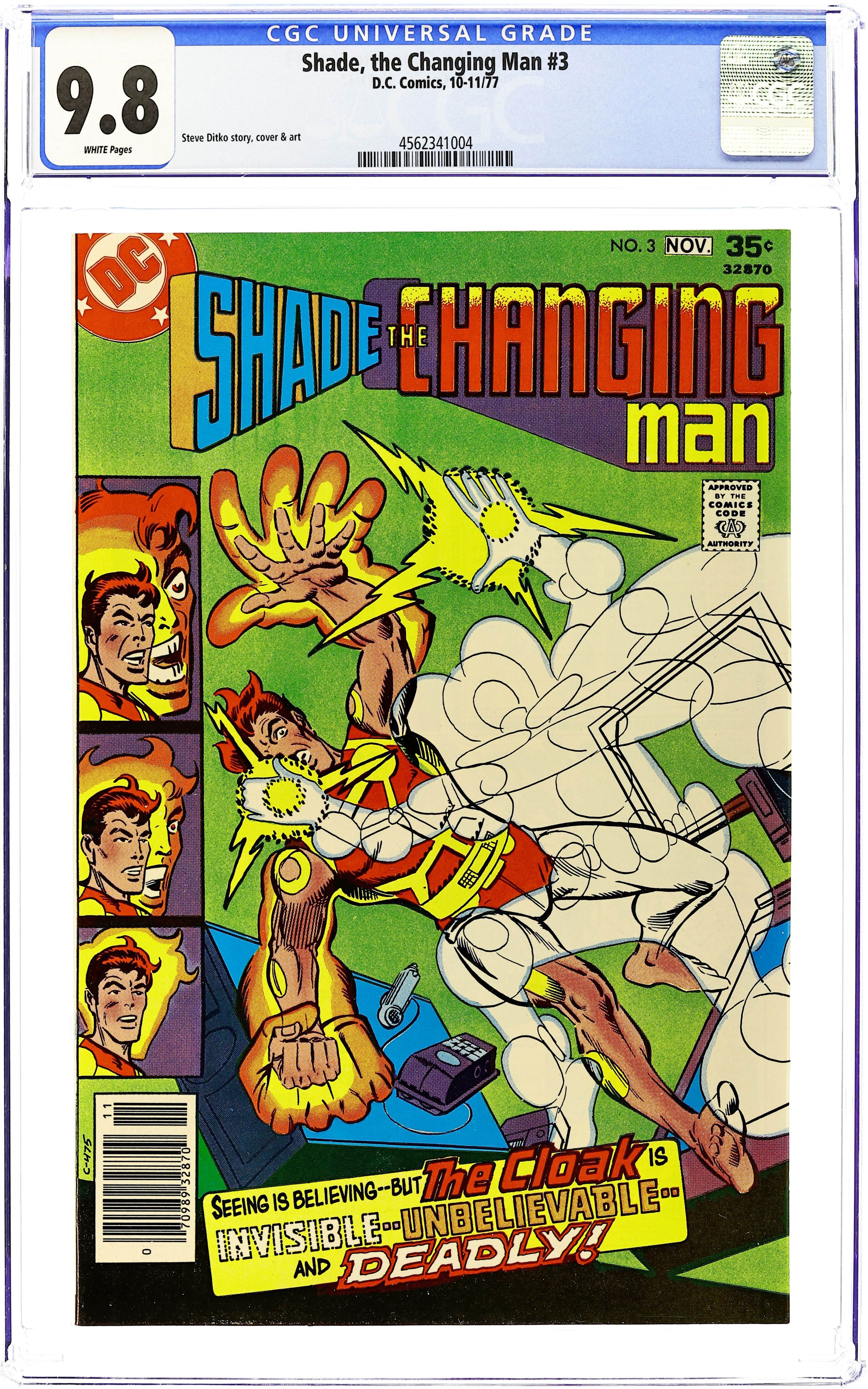 Cover by Steve Ditko. The Forms of Destruction!, script by Steve Ditko and Michael Fleisher, art by Steve Ditko; Shade The Cloak, who makes his first appearance; Shade is framed for a murder. Hostess ad with Wonder Woman, "Cooky La Moo On Broadway."36 pgs., full color. $0.35. Cover price $0.35.
