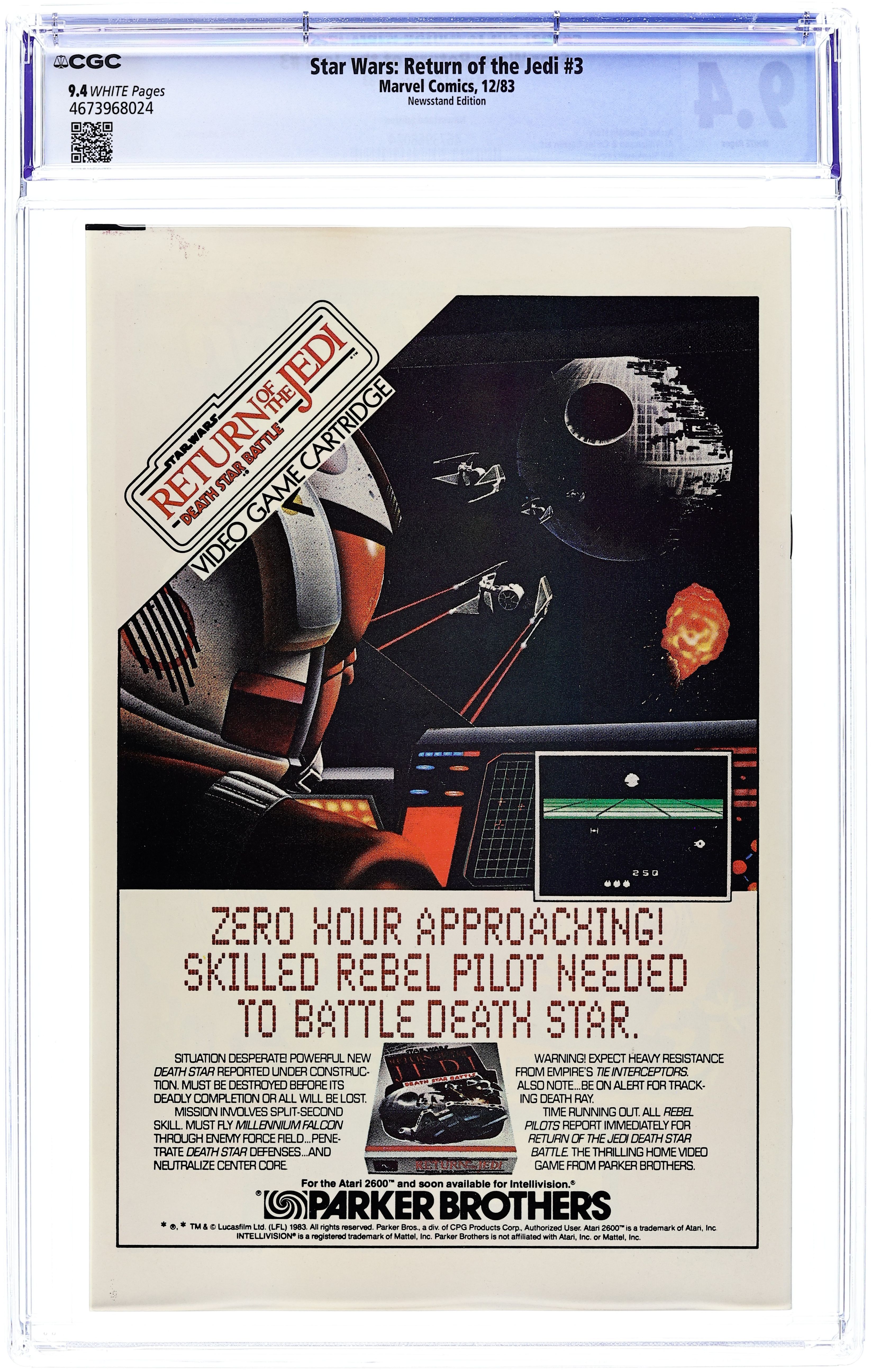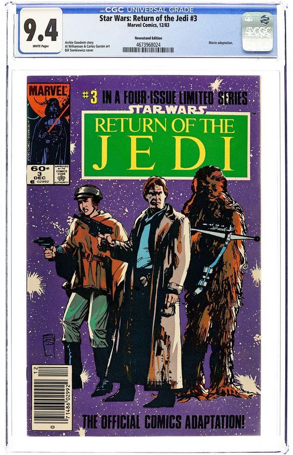 Direct Edition. Cover and splash page by Bill Sienkiewicz. "Chapter Three: The Mission To Endor!", script by Archie Goodwin, art by Al Williamson and Carlos Garzon; The Rebels travel to Endor to deactivate the Death Star II's Energy Shield, while Luke tells Leia the Family secrets. Imperial Scout On Speeder Bike pinup by Rick J. Bryant. General Lando Calrissian pinup by Rick J. Bryant. Admiral Ackbar's Mon Calamari Command Ship pinup by Rick J. Bryant. The Emperor (Death Star Throne Room pinup by Rick J. Bryant. Imperial Tie Interceptors (Twin Ion Engines) pinup by Rick J. Bryant. 36 pgs., full color. $0.60. Cover price $0.60.