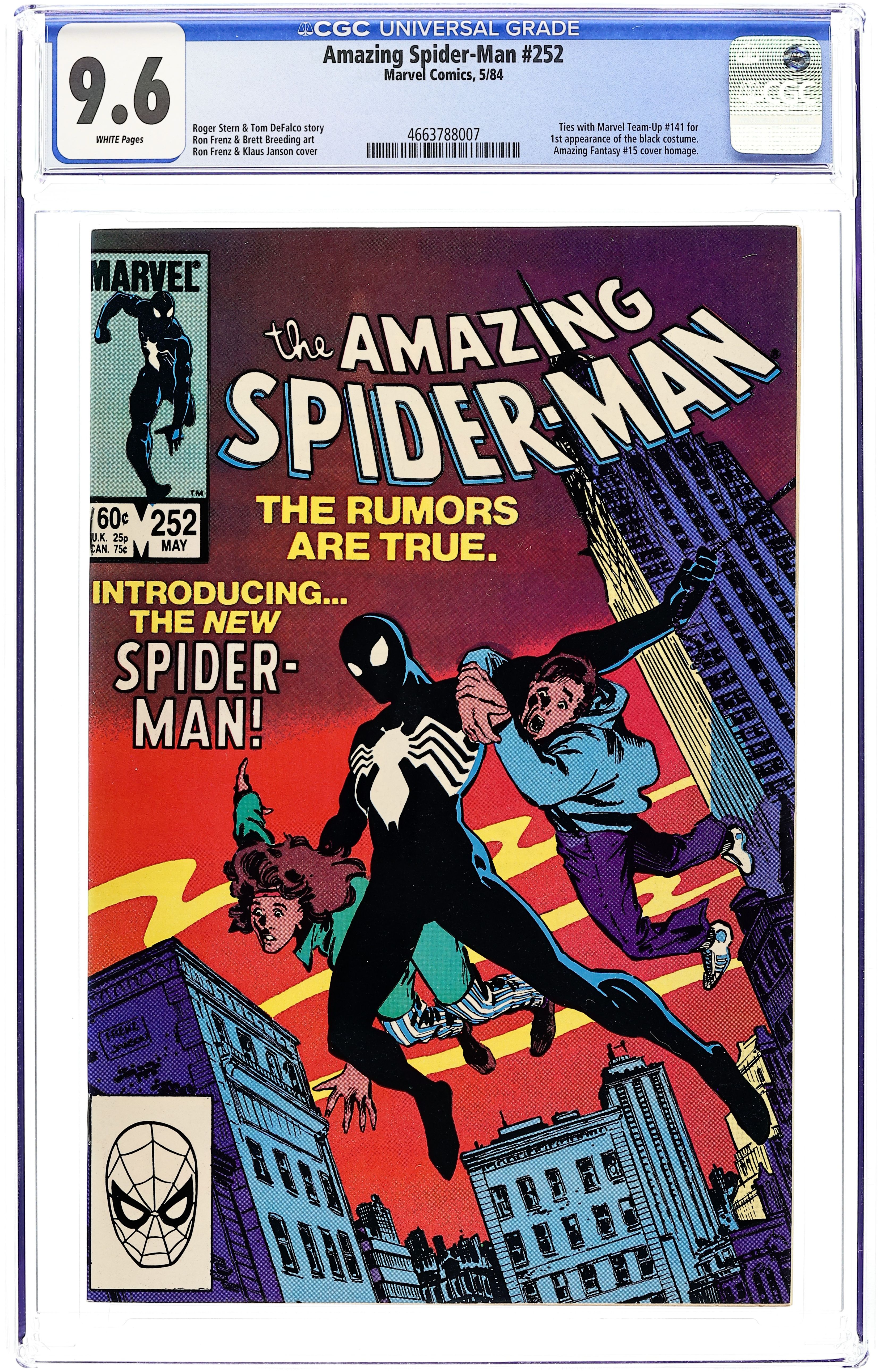 Tags: Chronological Appearances of Spider-Man's Black Costume (part 09 (1st Official Debut)), Marvel Legacy Numbering: Amazing Spider-Man (part 252), Secret Wars (1984) (part Aftermath 01), Spider-ManAmazing Spider-Man (1963 1st Series) 252N CGC 9.0 Newsstand Variant
