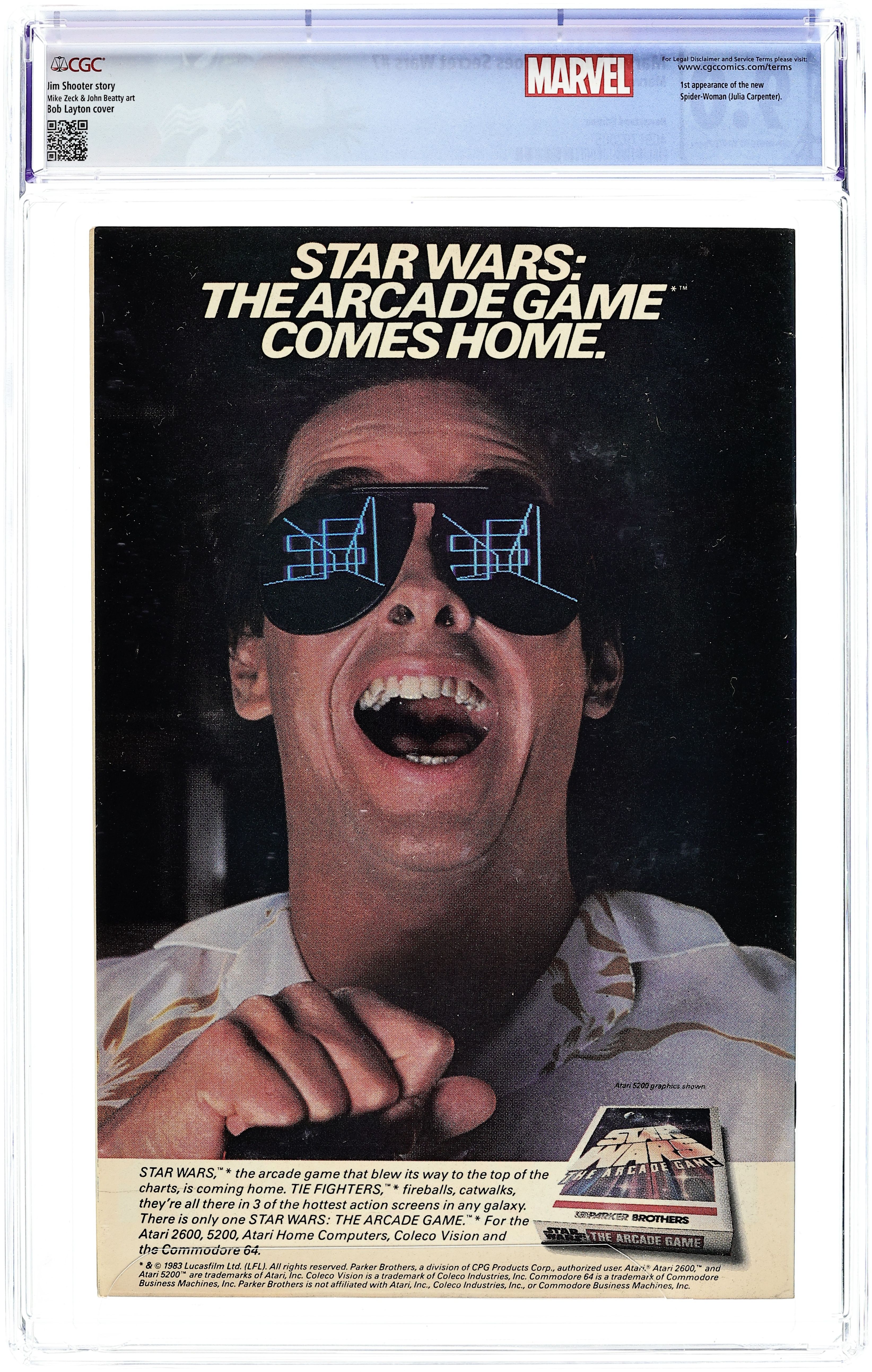Newsstand Edition. 1st appearance of Spider-Woman II (Julia Carpenter). "Berserker!" Part 7 of 12. Story by Jim Shooter. Art by Mike Zeck and John Beatty. Introducing Marvel's newest super-hero, Spider-Woman, a refugee from the displaced Denver, Colorado (NOTE: The Beyonder created Battleworld from pieces of hundreds of worlds from across the universe, Denver was one of those pieces). Plus, when the villains dump the Wasp's lifeless body into the heroes' camp, the Savage She Hulk decides to pay the bad guys a visit for some payback. But, has the emerald heroine finally bitten off more than she can chew? 36 pages, full color. Cover price $0.75.