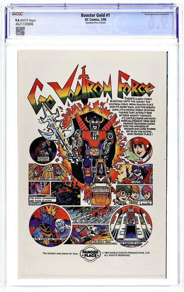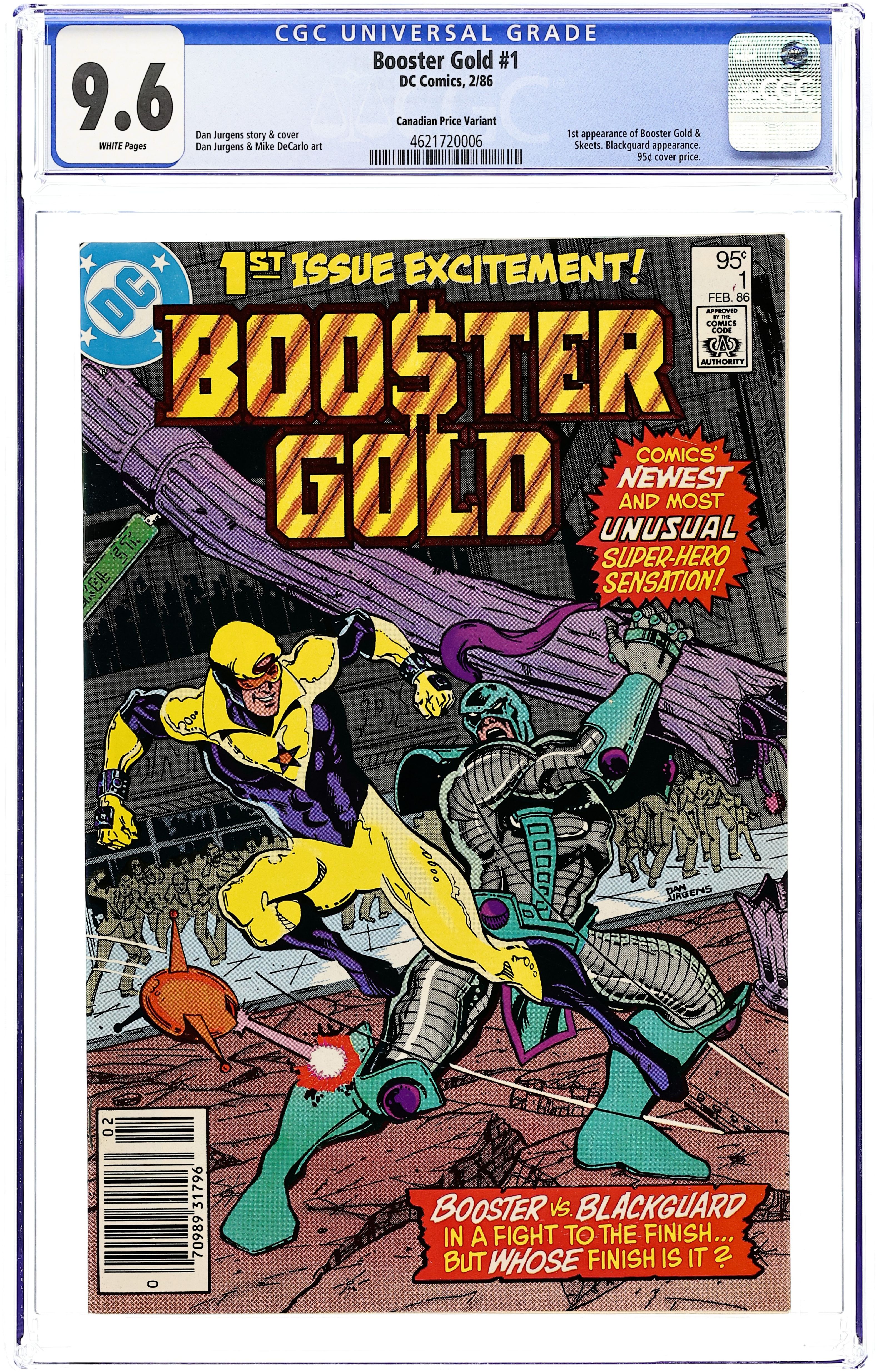 Canadian edition. After negotiating a movie deal, media darling Booster Gold is put to the test when he battles Blackguard in the streets of Metropolis in "The Big Fall". Script and pencils by Dan Jurgens, inks by Mike DeCarlo. Jimmy Olsen cameo. Jurgens cover. Cover price $0.95.
