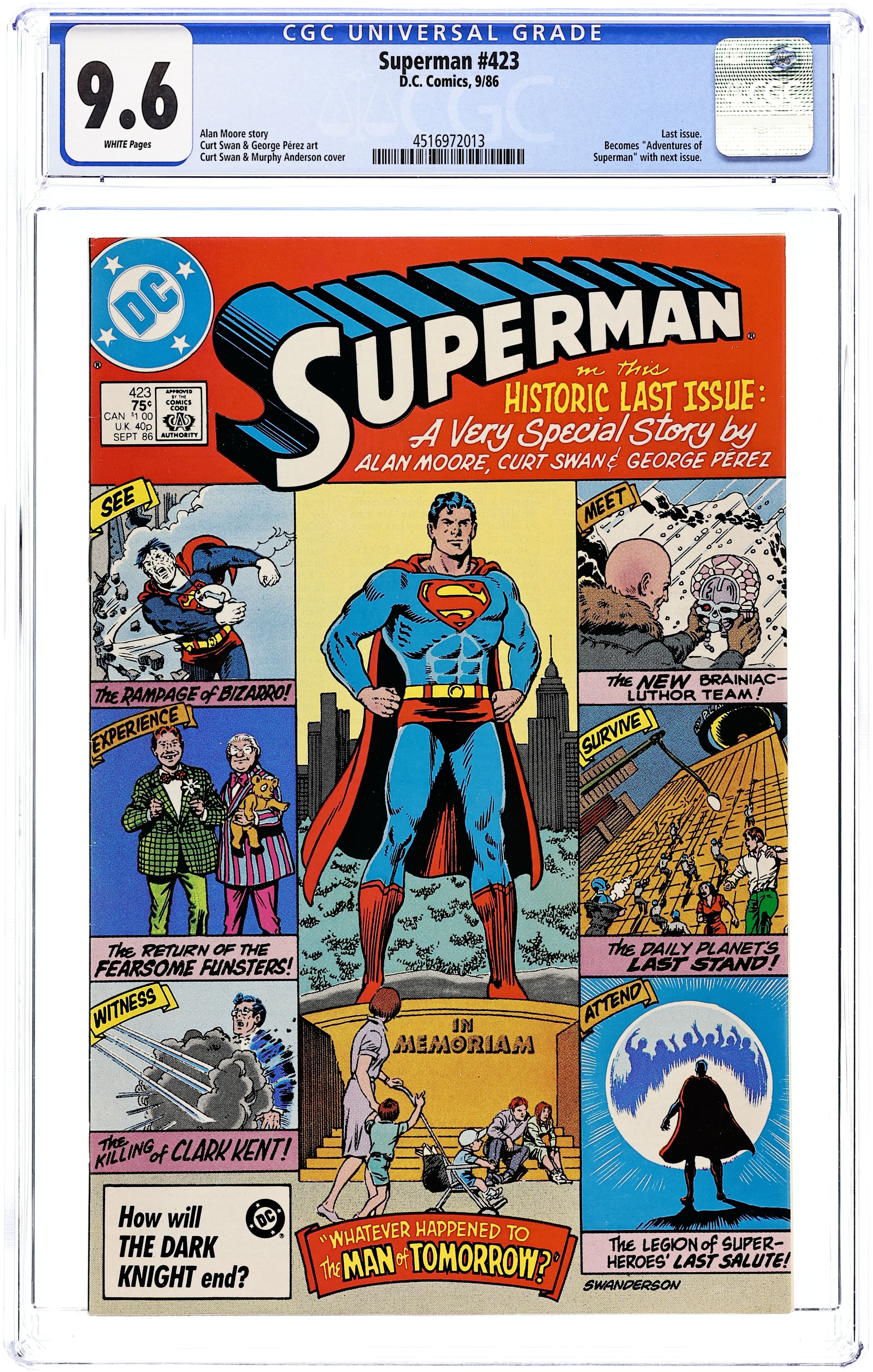 Direct Edition. Cover pencils by Ed Hannigan (layouts) and Curt Swan (as Swanderson), inks by Murphy Anderson (as Swanderson). "Whatever Happened to the Man of Tomorrow?", script by Alan Moore, pencils by Curt Swan, inks by Kurt Schaffenberger and Murphy Anderson (uncredited); Lois continues to relate how when Superman was holed up in the Fortress with his closest friends, being attacked by Brainiac (having taken over Luthor's body), the Kryptonite Man, and the Legion of Super-Villains, he realized who the mastermind behind it all was, and called on Mr. Mxyzptlk to show himself; Just as Superman sent Mxyzptlk into the Phantom Zone, Mxy fled to his own dimension, tearing himself apart; Having taken a life, Superman exposed himself to gold kryptonite and retired. Legendary story continued from Superman #423. Superman in Action article by E. Nelson Bridwell; The history of Superman in Action Comics. 36 Pages, Full Color, $0.75. Cover price $0.75.