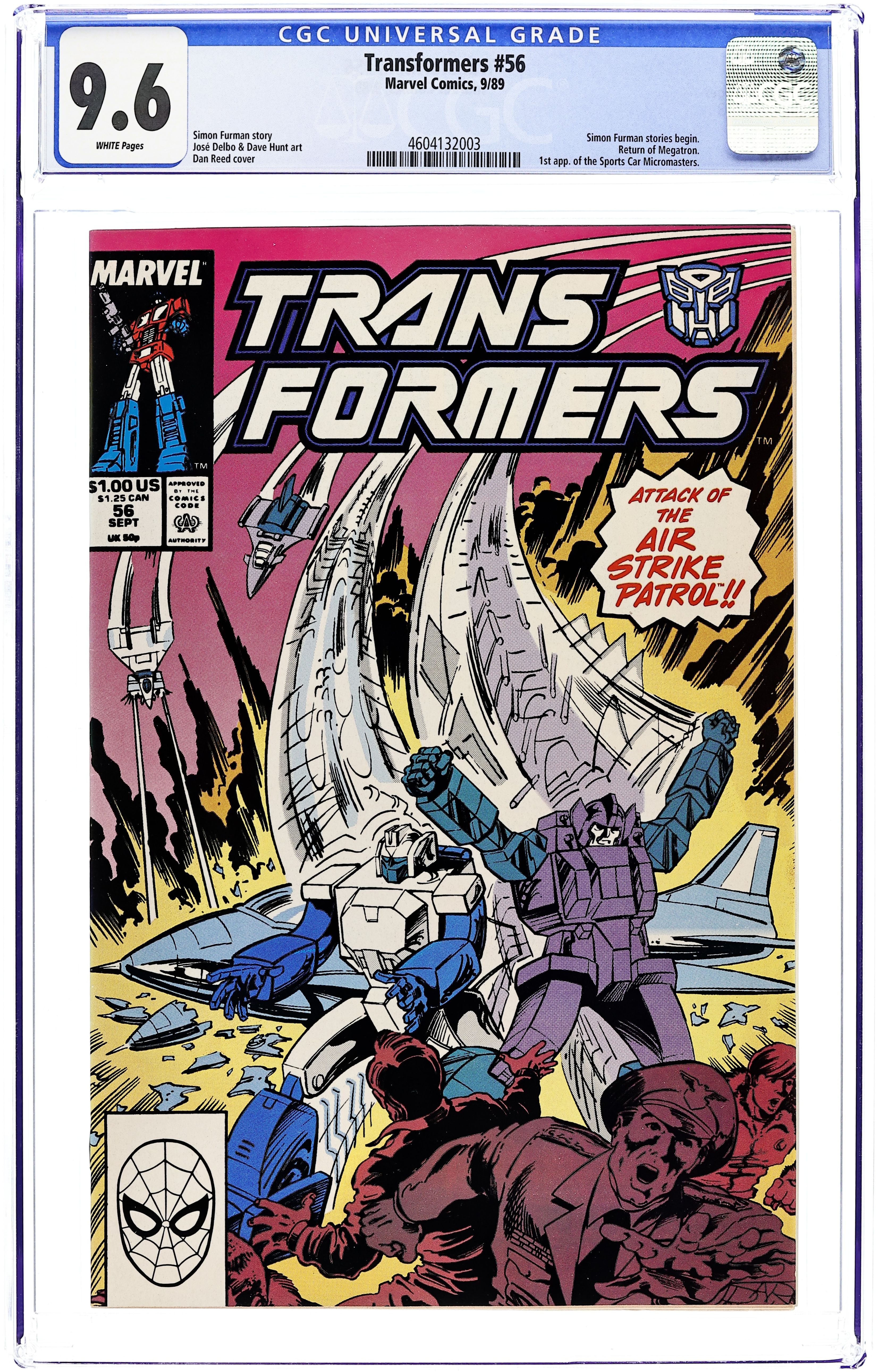 Direct Edition. While Ratchet, the Autobots chief surgeon, is haunted by his failed attempts to save injured and broken Autobots, the Decepticons Air Strike Patrol strikes at and takes over an air force base and its Optimus Prime and company to the rescue in Back from the Dead. Script by Simon Furman and art by Jose Delbo & Dave Hunt. Issue also has profile pages on Battletrap, Blot, and Cutthroat Decepticons and Goldbug, Rollbar, and Wide Load Autobots. Cover price $1.00.