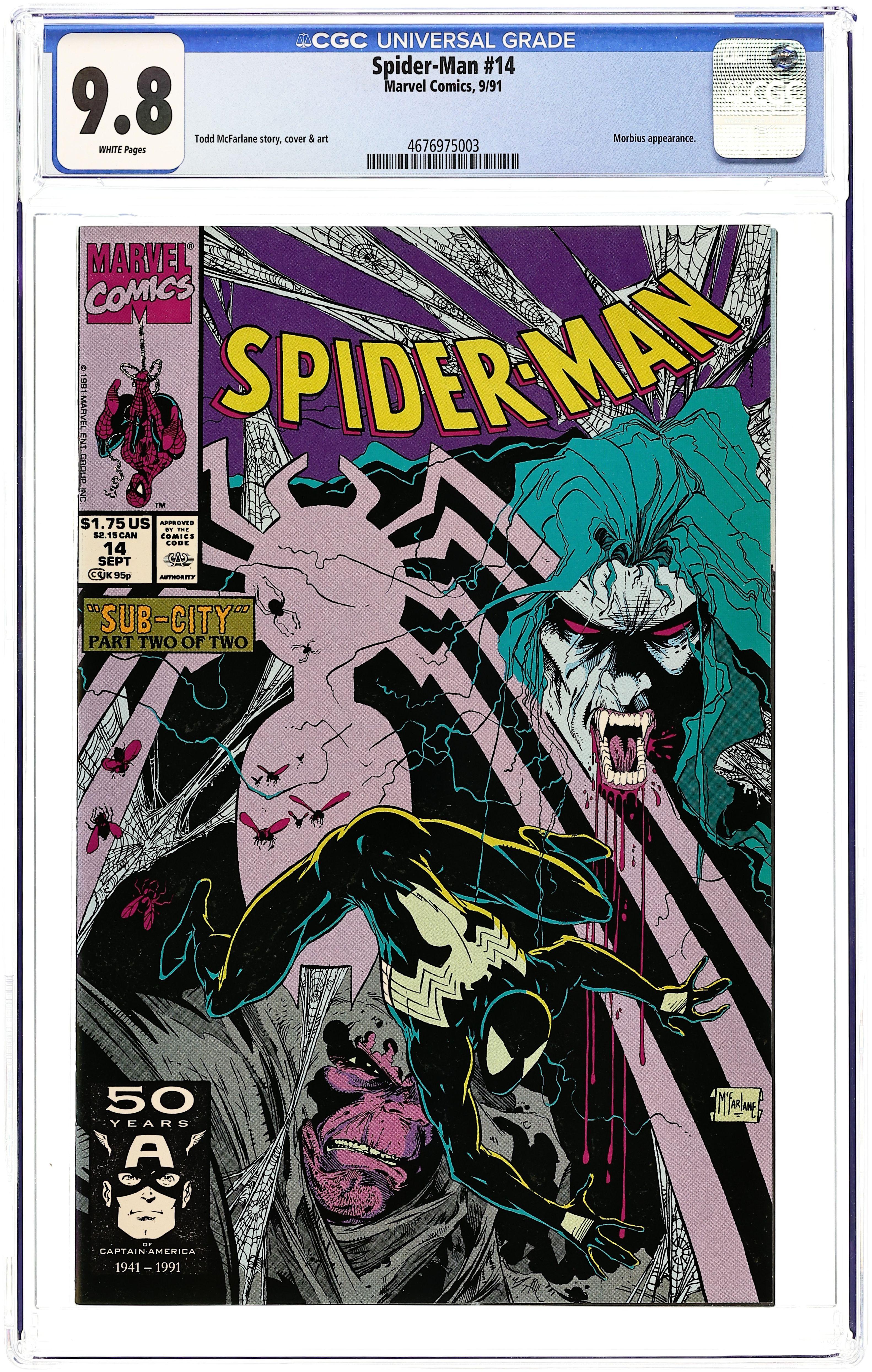 Direct Edition. Sub-City Part 2 of 2. Script and art by Todd McFarlane. Cover by Todd McFarlane. The wondrous wall-crawler -- dressed in his old black costume -- descends into the caverns below Manhattan to find the missing homeless people. And after sifting through a group of hostile underground dwellers, the amazing one meets their leader: Morbius! What a surprise! Why is the Living Vampire...living underground? Gruesomely, it's because Morbius has found a new way to acquire victims for his feedings. Oh boy, Spider-Man cannot let this continue. And that means war with the Living Vampire! 32 pages. Cover price $1.75.