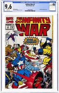 Story by Jim Starlin. Art by Ron Lim and Al Milgrom. The Avengers, Fantastic Four, X-Men, X-Factor, Alpha Flight, Daredevil, Hulk, Moon Knight, and the New Warriors have all gathered at the behest of Reed Richards. Meanwhile, Galactus, Silver Surfer, Nova, and Dr. Strange investigate a mystical disturbance, followed in the shadows by the nefarious duo Dr. Doom and Kang. Thanos, Adam Warlock and the Infinity Watch pay a visit to Mistress Death to discover a startling revelation. Plus, when the volatile mutant Wolverine accuses Reed Richards of being an imposter the tensions between the mutant heroes and the others escalates into a battle royal. Then, the evil-Reed doppleganger springs his trap as a gamma bomb explodes. Story by Jim Starlin. Art by Ron Lim and Al Milgrom. 48 pages. Cover price $2.50.