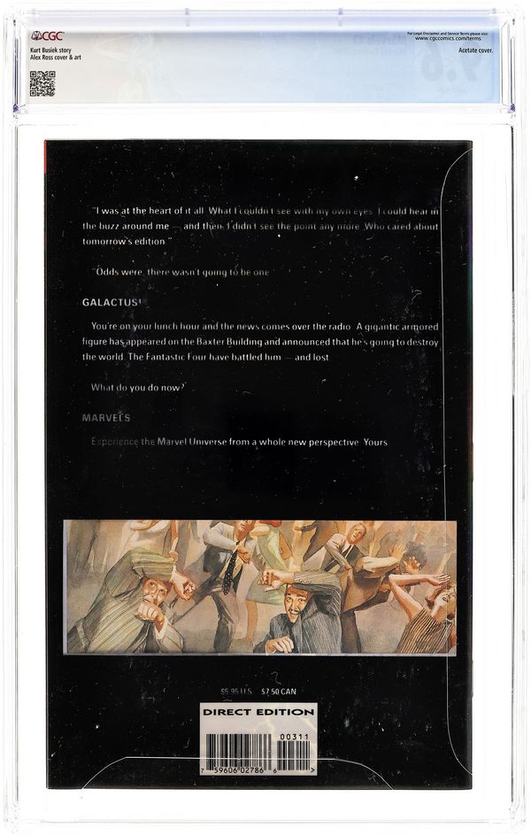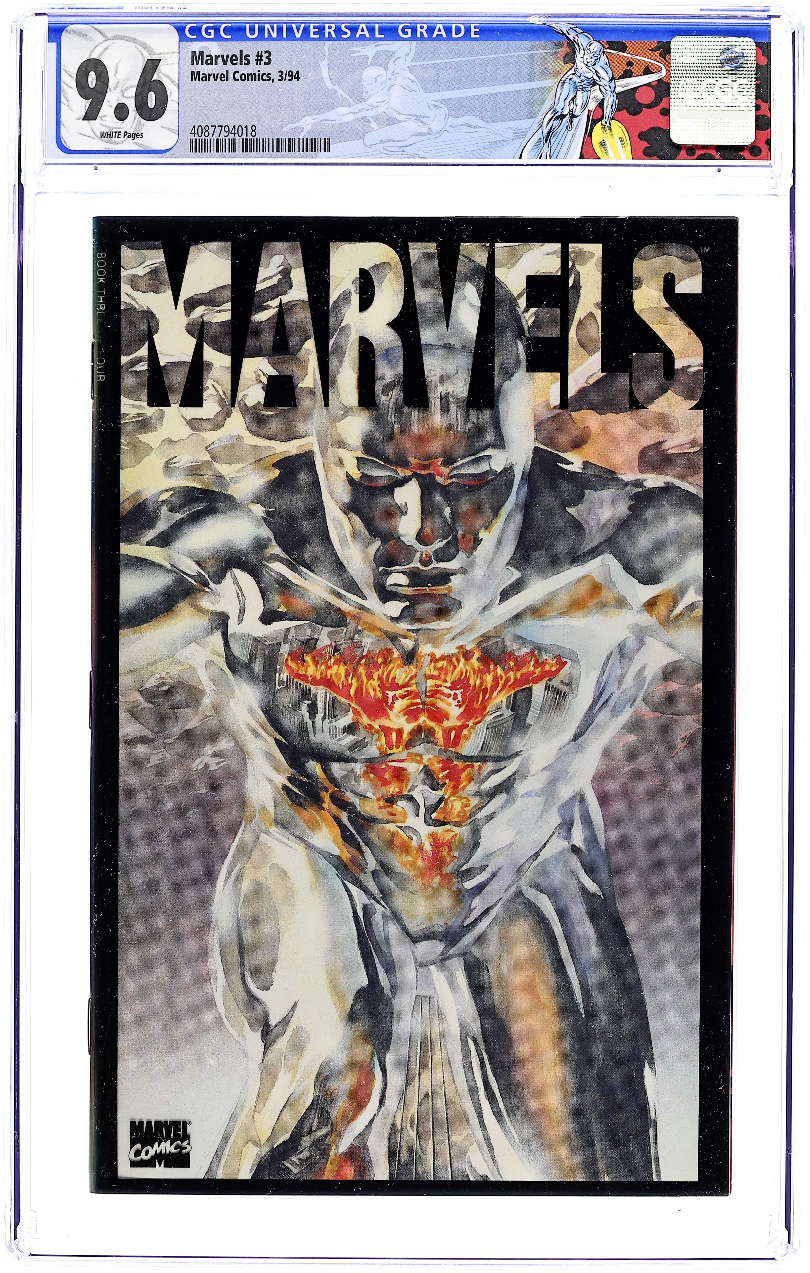 Steeped in unprecedented realism, this groundbreaking series tells the tale of the classic Marvel Universe as seen through the eyes of photojournalist Phil Sheldon. Book three chronicles the coming of Galactus and the Silver Surfer. Written by Kurt Busiek, with painted art by Alex Ross. This is the 1st printing and has an acetate (plastic) outer cover. The 2nd printing does not have an acetate cover. Cover price $5.95.