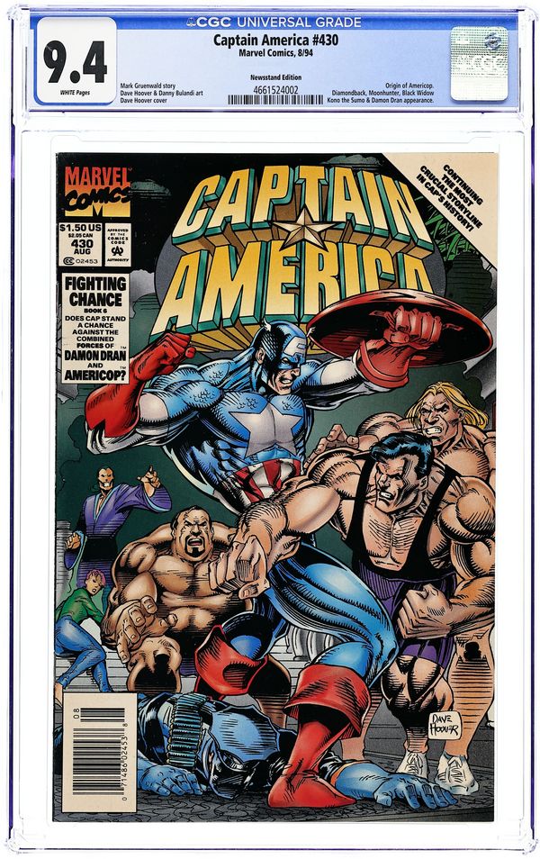 Newsstand Edition. "Cop Out" Fighting Chance Part 6 of 12. Guest-starring the Black Widow. Script by Mark Gruenwald. Pencils by Dave Hoover. Inks by Danny Bulanadi. Cover by Dave Hoover. Inside Damon Dran's New Orleans mansion, the shield-slinger is down and Americop is out! Moments earlier Cap barged into the sprawling complex to rescue Diamondback and Moonhunter! While Americop busted in…to just bust heads! However, both the hero and the anti-hero fell in their fight against Dran's muscle-bound goons! But during the mêlée, Diamondback slipped away and made a call for help back to Avengers Mansion! And now Cap's leading lady and the Black Widow charge into the fray to save the star-spangled avenger! Will Diamondback and the widow be able to take down Damon Dran? And also avoid Americop's line of fire? It's a wild night down on the bayou! Brief origin of Americop. (Notes: Americop returns many years later in Thunderbolts Desperate Measures 1 (published in 2007). This issue includes a one-page pin-up featuring Captain America and the Red Skull by Danta Bastiamomi and Ralph Cabrera. The pin-up promotes the upcoming release of the Streets of Poison trade paperback.) 36 pages. Cover price $1.50.