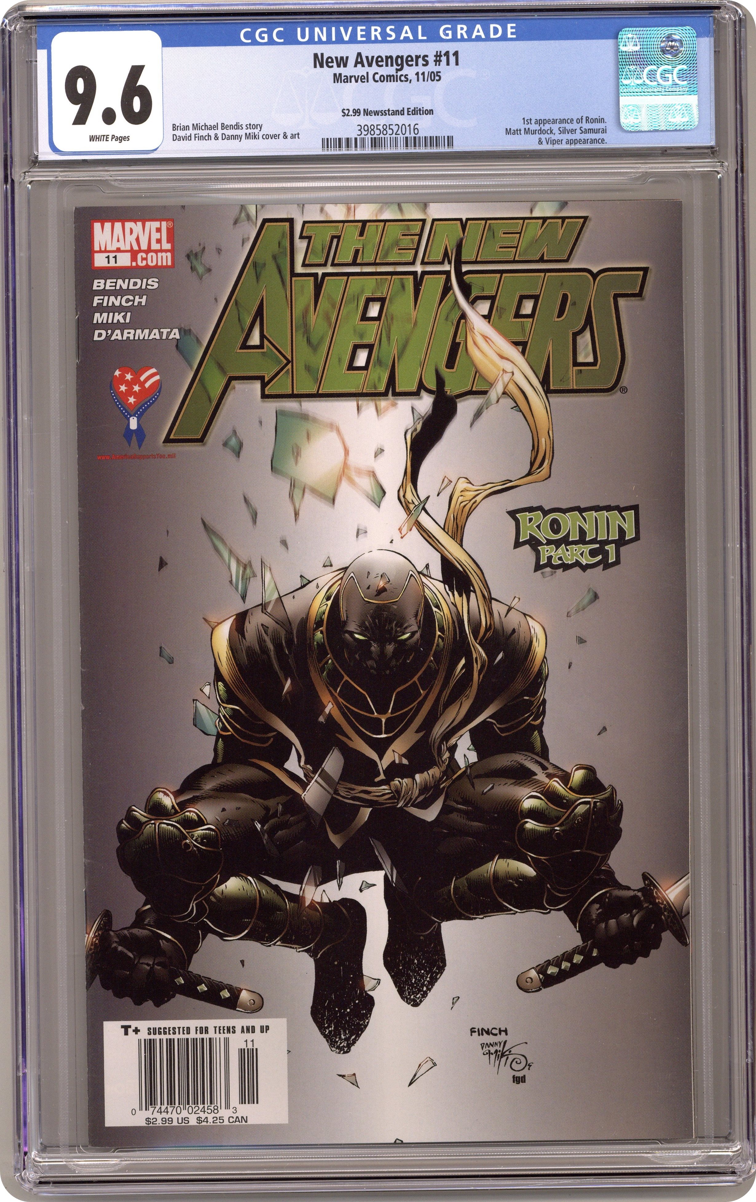 Direct Edition. $2.50 cover price. Written by Brian Michael Bendis Pencils & Cover by DAVID FINCH 'RONIN' Part 1 (of 3) David Finch returns to debut the mysterious New Avenger everyone has been talking about all year!! Who is RONIN and why has Captain America recruited him into the fold? Bet it has something to do with Hydra helping the Silver Samurai get out of the country after he broke out of prison. Just sayin'! And what is Ronin's true identity? Here's a hint: He's not Daredevil! Cover price $2.50.