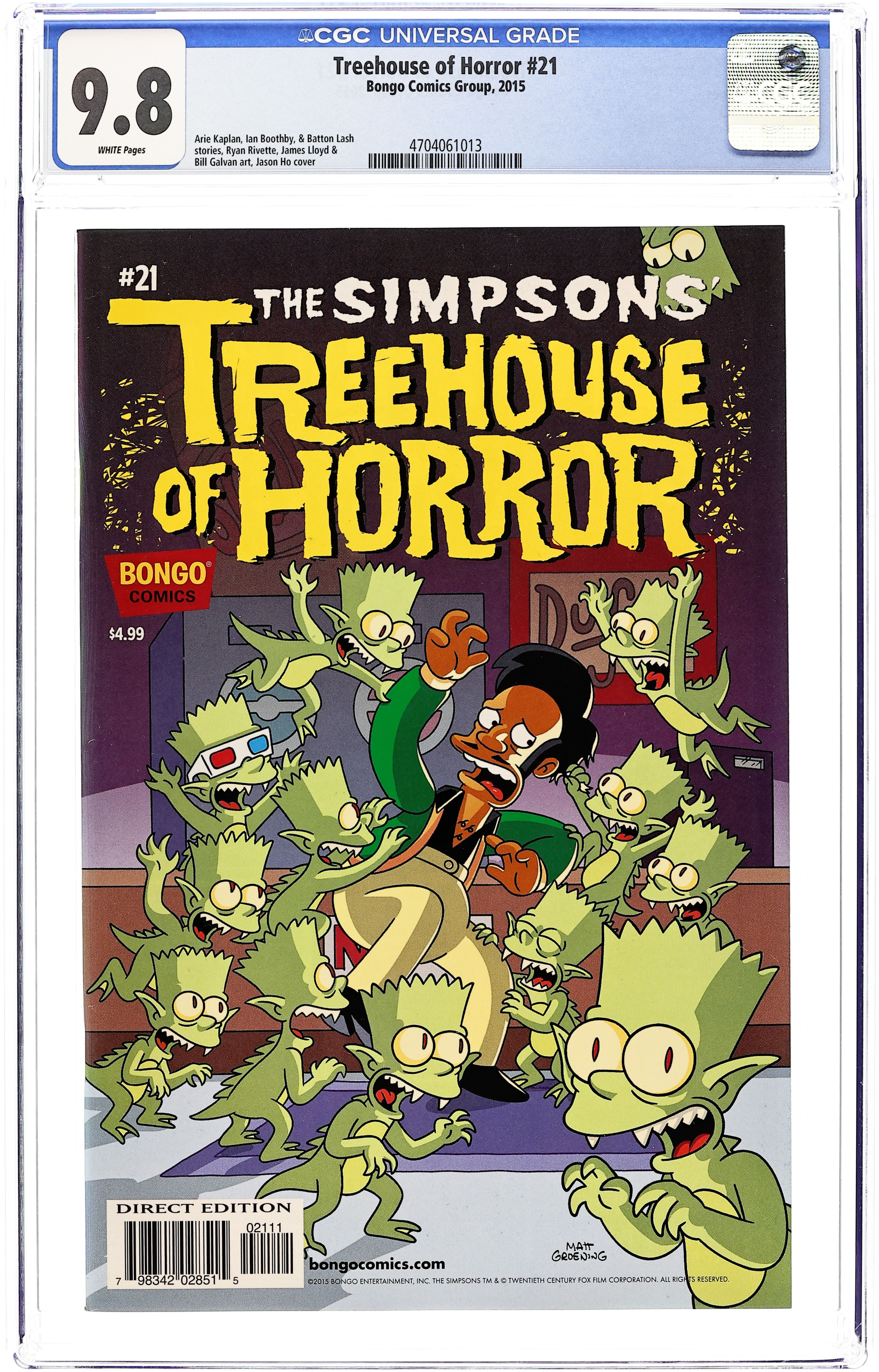 Written by Arie Kaplanm, Ian Boothby and Batton Lash. Art by Ryan Rivette, James Lloyd and Bill Galvan. Cover by Jason Ho. Ned Flanders believes he has missed 'The Rapture' until he discovers that everyone who has been left behind is left-handed! Then, Apu accidentally receives a shipment of adorable gremlins intended for the sorcery shop a few doors down the block; unfortunately, he doesn't read the warning that tells him not to feed them Squishees after midnight. And visit the 'metropolitan' world of Fritz Lang (Simpsons-style), when the idle rich championed by Mr. Burns clash with the working poor led by Marge Simpson. 44 pages, full color. Cover price $4.99.
