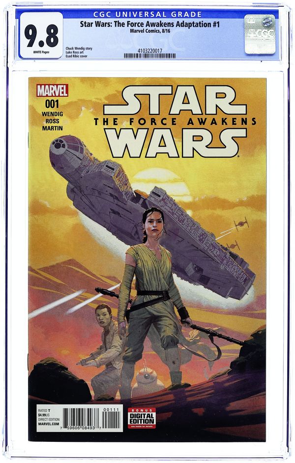 Written by Chuck Wendig. Art by Luke Ross. Cover by Esad Ribic. It's true-all of it! The biggest movie of the year jumps from the big screen to the comic book page! It's been three decades since the Rebel Alliance destroyed the Death Star and toppled the Galactic Empire...but now, on the remote planet of Jakku...there is a stirring in the Force. A young scavenger named Rey...a deserting stormtrooper named Finn...an ace pilot named Poe...and a dark apprentice named Kylo Ren...Their lives are about to collide as the awakening begins. 44 pages, full color. Rated T Cover price $4.99.