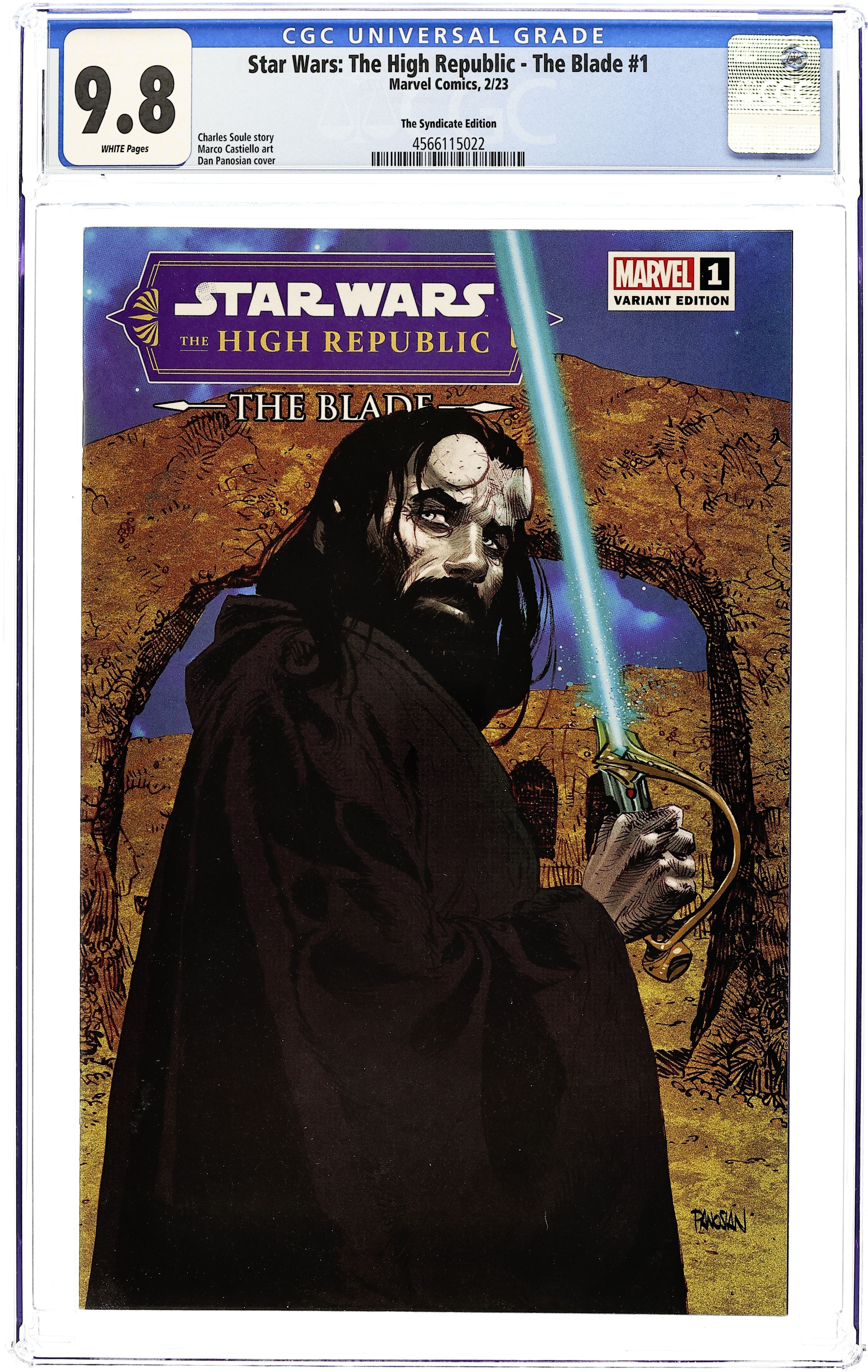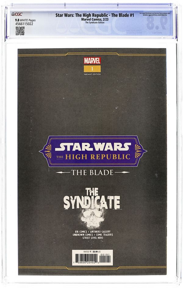 The Syndicate (616 Comics, AntiHero Gallery, Unknown Comics, Comic Traders, and Street Level Hero) Exclusive Cover by Dan Panosian. Written by Charles Soule. Art by Marco Castiello. Hundreds of years before the Skywalker Saga, witness the rise of a legend - the mighty Jedi PORTER ENGLE, perhaps the most skilled lightsaber wielder in the High Republic. With his fellow Jedi Knight Barash, he travels the galaxy, serving as a guardian of peace and justice. But even Porter Engle has enemies he cannot defeat. 28 pages, full color. Rated T