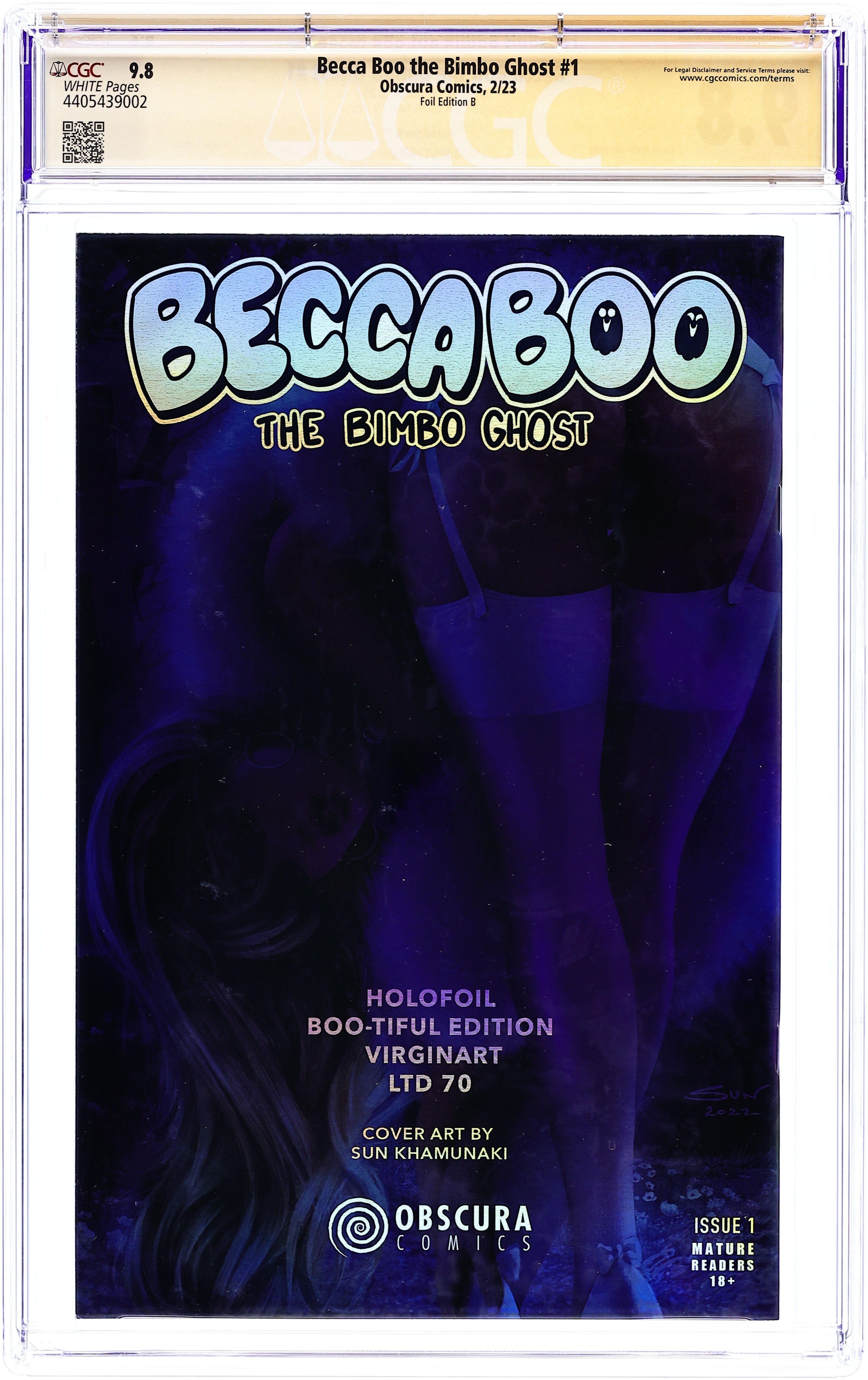 Published Feb 2023 by Obscura Comics.Becca Boo the Bimbo Ghost (2023 Obscura Comics) 1B.B.FOIL CGC 9.8 SS Khamunaki