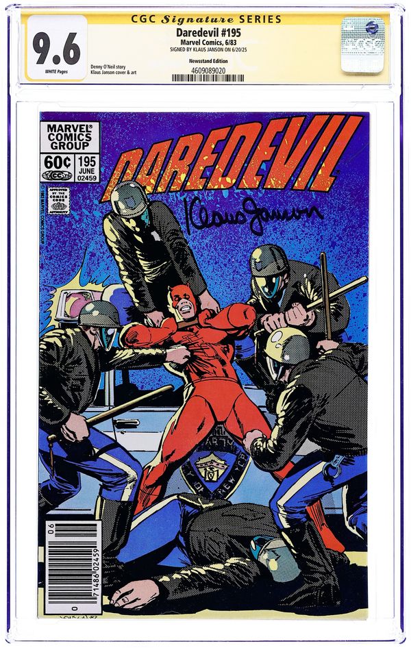 Newsstand Edition. Cover pencils by Frank Miller, inks by Klaus Janson. Good Guys Wear Red!, script by Frank Miller and Roger McKenzie (uncredited), pencils by Frank Miller, inks by Klaus Janson; DD and the Punisher hunt down Hogman for selling drugs to kids, but the two heroes clash over their methods; DD ends up shooting the Punisher with his own gun; 2nd part of Angel Dust story originally rejected by the CCA. Letter to the editor from comics editor Diana Schutz. 36 pgs. Cover price $0.60. Cover price $0.60.