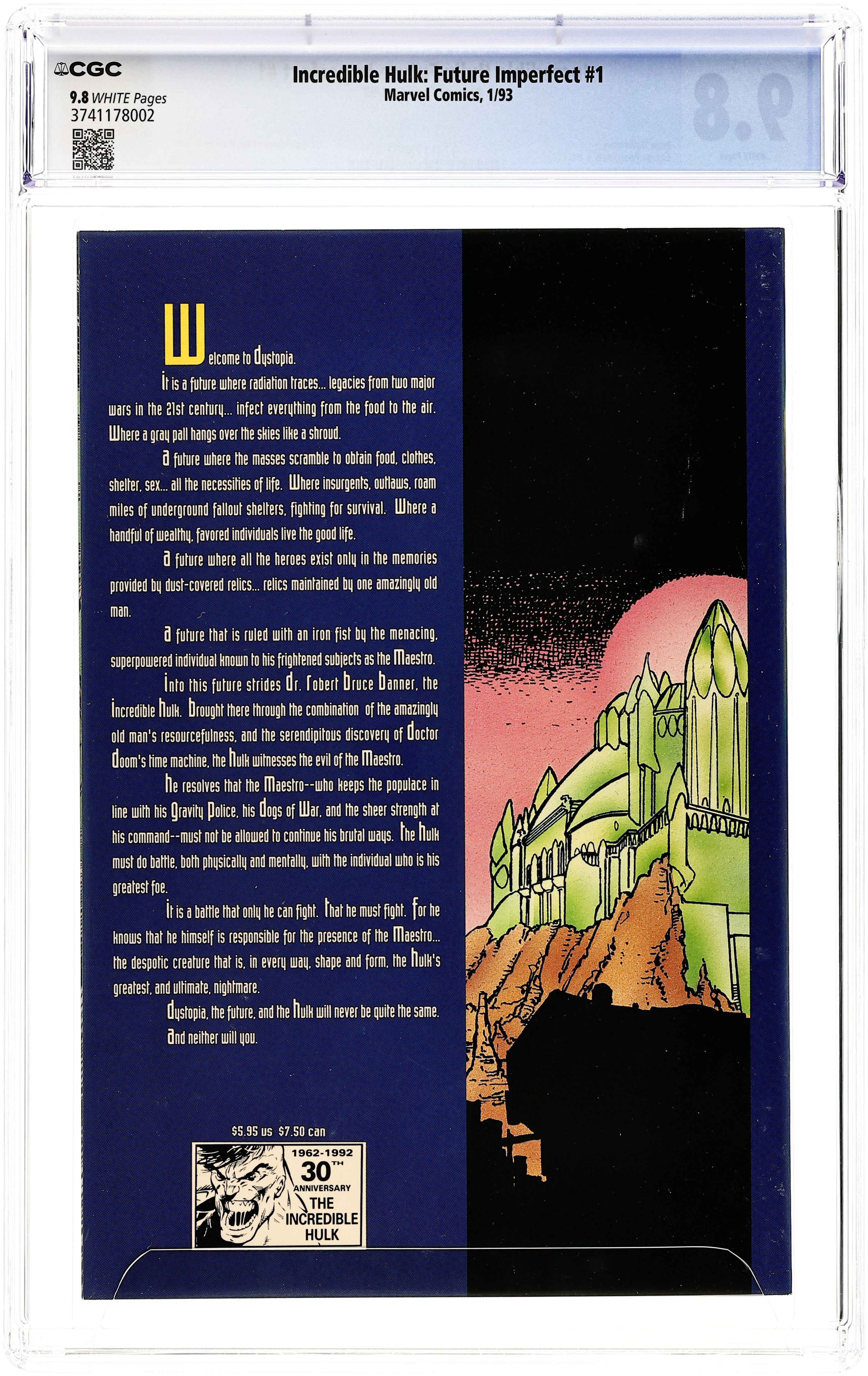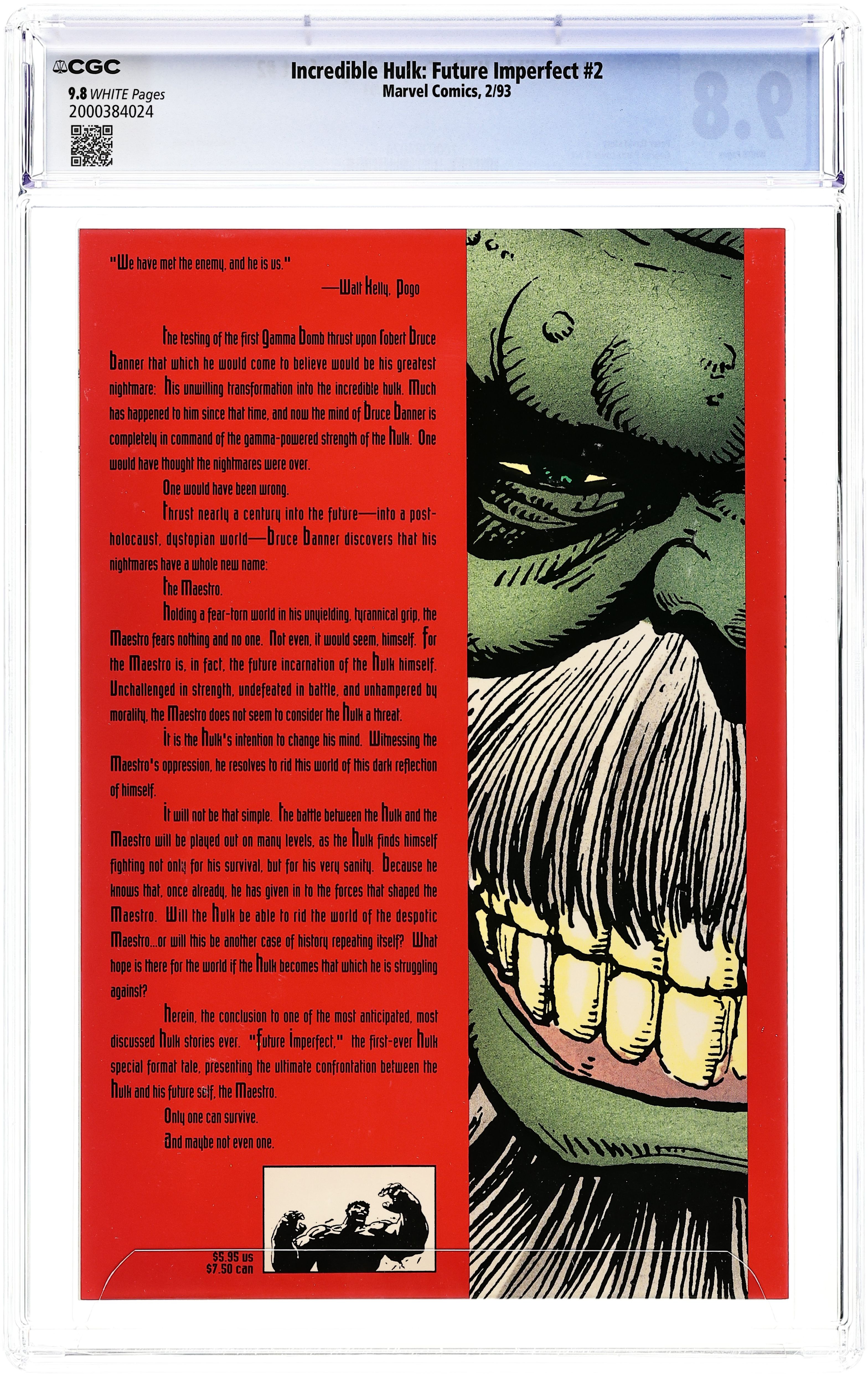 Future Imperfect: Part 2 of 2 - Written by Peter David. Art and Cover by George Perez. Featuring an embossed cover! The Maestro conquers the Hulk and holds him prisoner! Will dreams of power seduce the Hulk into ruling Dystopia alongside his captor? Also featuring Rick Jones and Janis (Rick Jones' great granddaughter). Softcover, 48 pages, full color. Cover price $5.95.