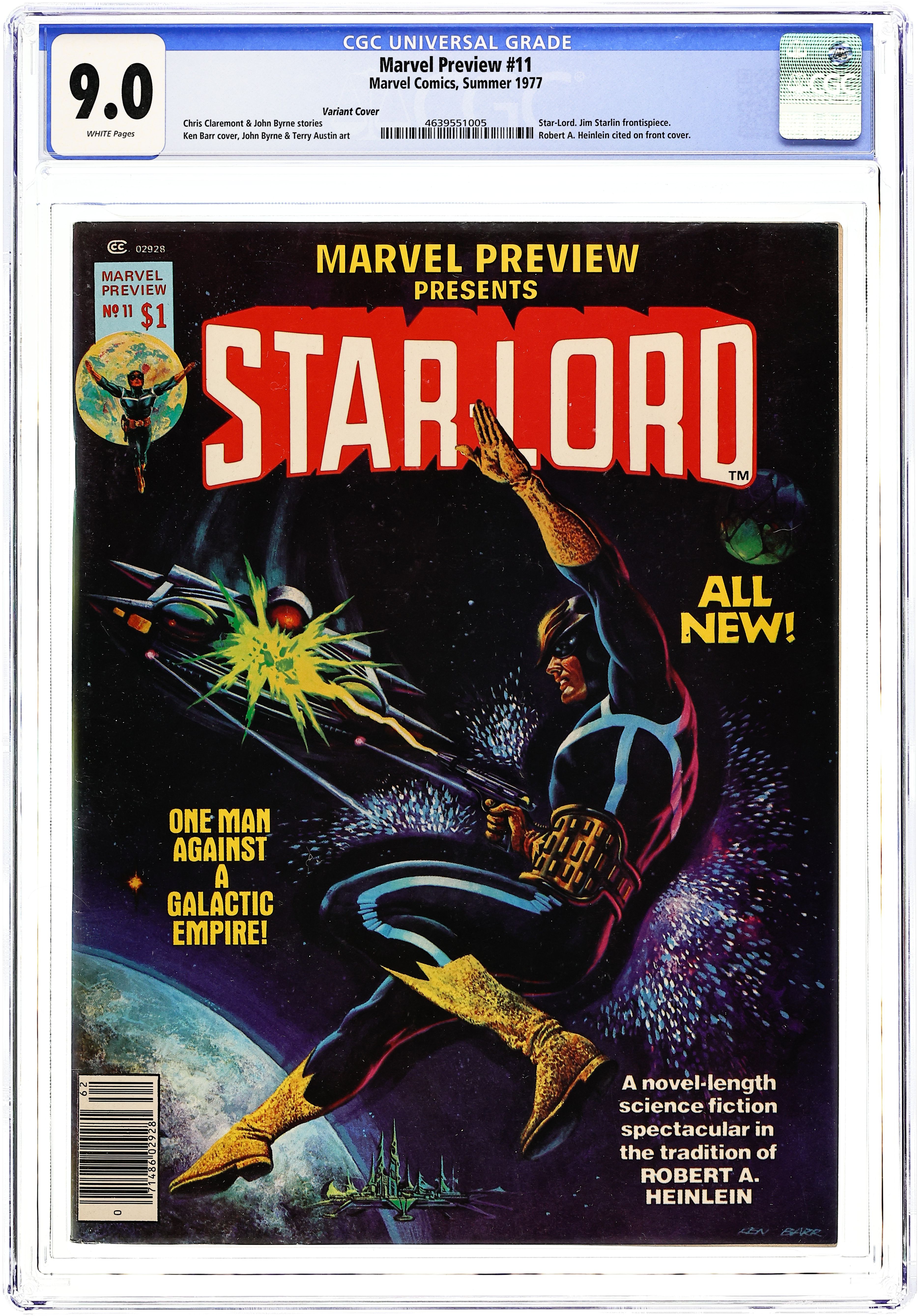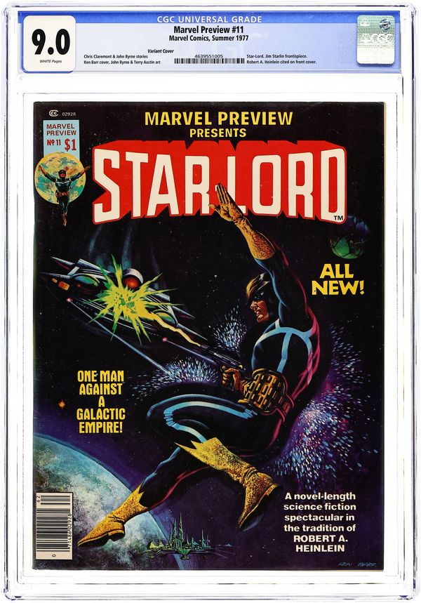 Initial Printing with the Robert Heinlein cover blurb, later removed due to objections by Heinlein. Cover art by Ken Barr; Star-Lord illo by Jim Starlin; Second Launch! article by John Warner; Star-Lord illo penciled by John Byrne, inked by Terry Austin; Windhölme Star-Lord story by Chris Claremont, pencils by Byrne, inks by Austin; Cinnibar Star-Lord story by Claremont, pencils by Byrne, inks by Austin; Sparta Star-Lord story by Claremont, art by Byrne and Austin; The Hollow Crown Star-Lord story by Claremont, art by Byrne and Austin; afterword by Claremont; and Our Alien Heritage or The Central-Casting Syndrome article by Byrne. 68 pages, full color. Cover price $1.00.