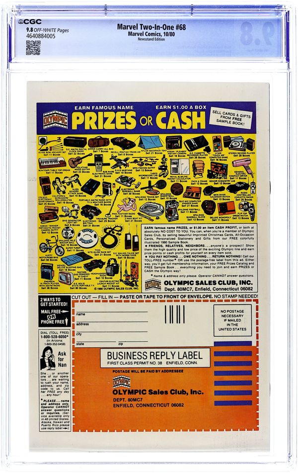 Direct Edition. "Champion!" Guest-starring Thor, Hulk, Sub-Mariner, Colossus, Sasquatch, Doc Samson, and Wonder Man. Cameos by the Fantastic Four, Avengers, and X-Men. Story by Tom DeFalco. Art by Ron Wilson, Camp Esposito, Giacoia, Dan Green, and Chic Stone. In arguably the best Thing story of all, a cosmic immortal known as the Champion, a being of nigh immeasurable strength whose existence is defined by physical contest, arrives on Earth and wishes to test his mettle against the mightiest heroes this planet has to offer. If they do not fight, this powerful being will destroy the Earth. After readily dispatching all contenders, the last man standing is Aunt Petunia's favorite nephew. But, can even the strongest member of the Fantastic Four hope to defeat an Elder of the Universe? 48 pages.