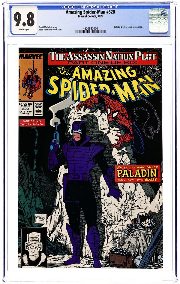 Direct Edition. The Assassin Nation Plot begins in "License Invoked" Part 1 of 6. Guest-starring Paladin. Script by David Michelinie. Art by Todd McFarlane. Cover by Todd McFarlane. What starts as a simple investigation into a Lower Manhattan robbery takes the Amazing Spider-Man on a journey across the globe and into a web of international espionage and murder! After seeing bodies lying on the ground, the web-slinger busts inside a warehouse and discovers his erstwhile ally Paladin! What is the purple-clad mercenary doing in this neck of the woods? He's probing into the Life Foundation --- an organization the wall-crawler knows all too well! The doomsday profiteers always play for keeps...as Paladin and Spidey find out...the hard way! Cameo appearances by Mary Jane Watson, Harry Osborn, Aunt May, and Silver Sable. (Notes: Paladin and the web-slinger previously worked together in Spectacular Spider-Man 105 & 106. The letters page includes a letter from Topps comics publisher Charles Novinskie.) 36 pages. Cover price $1.00.