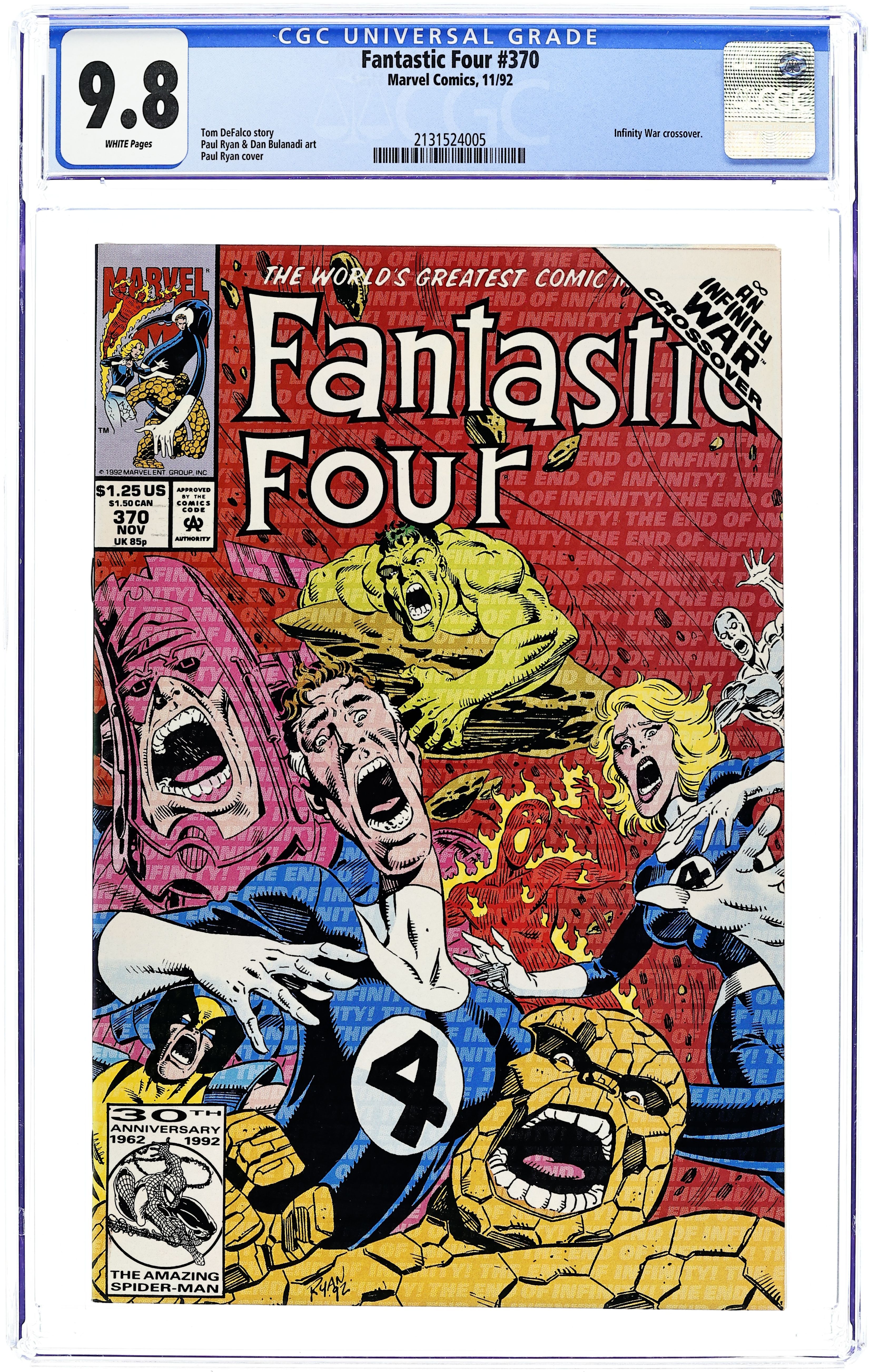Infinity War tie-in. "Forever Evil!" Guest-starring the X-Men, Avengers, X-Factor, Daredevil, New Warriors, Alpha Flight, and the Hulk. Story by Tom DeFalco and Paul Ryan. Art by Paul Ryan and Danny Bulanadi. Cover by Paul Ryan. Story continued from Infinity War (1992) #5. The sinister Magus has obtained ultimate power and makes his move for universal control. Can the FF and the rest of the heroes of the Marvel Universe somehow find a way to defeat him before it is too late? Plus, learn the surprising role the Invisible Woman played in Thanos' battle with his doppleganger in Infinity War #5. Story concludes in Infinity War (1992) #6. 36 pgs. Cover price $1.25.