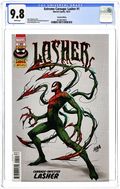 The 616 Comics and Jolzar Collectibles exclusive cover by Jonboy Meyers. Written by Phillip Kennedy Johnson. Art by Manuel Garcia. VIOLENCE RUNS IN THE FAMILY! As the dust continues to settle after the species-redefining KING IN BLACK saga, Eddie Brock and his son, Dylan, won't be the only ones learning to adjust to a new normal. Collectively called the Life Foundation, symbiotes SCREAM, PHAGE, RIOT, LASHER and AGONY have tried to reconcile the sometimes-noble intentions of their hosts with their often-bloodthirsty impulses. But the Life Foundation symbiotes aren't the only ones with a part to play in this story, and they aren't the only symbiotes who find themselves reinvented after KING IN BLACK. They have an older sibling who may be reinvented in its own right: CARNAGE. 36 pages, full color. Rated T+