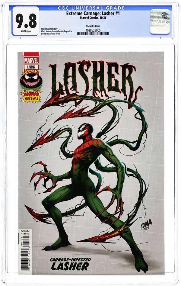 Limited 1 for 10 Retailer Incentive Variant Cover. Written by Clay McLeod Chapman. Art by Chris Mooneyham. Cover by David Nakayama. WITNESS THE BIRTH OF A NEW SYMBIOTE! Four issues into the Carnage event of the summer and the bodies just keep piling up - including some of the Venomaniacs the Mighty Marveldom know and love! But now is not a time to mourn for fallen heroes (or their symbiotes). CARNAGE is on the loose, and he's building an army… 28 pages, full color. Rated T+ Cover price $3.99.