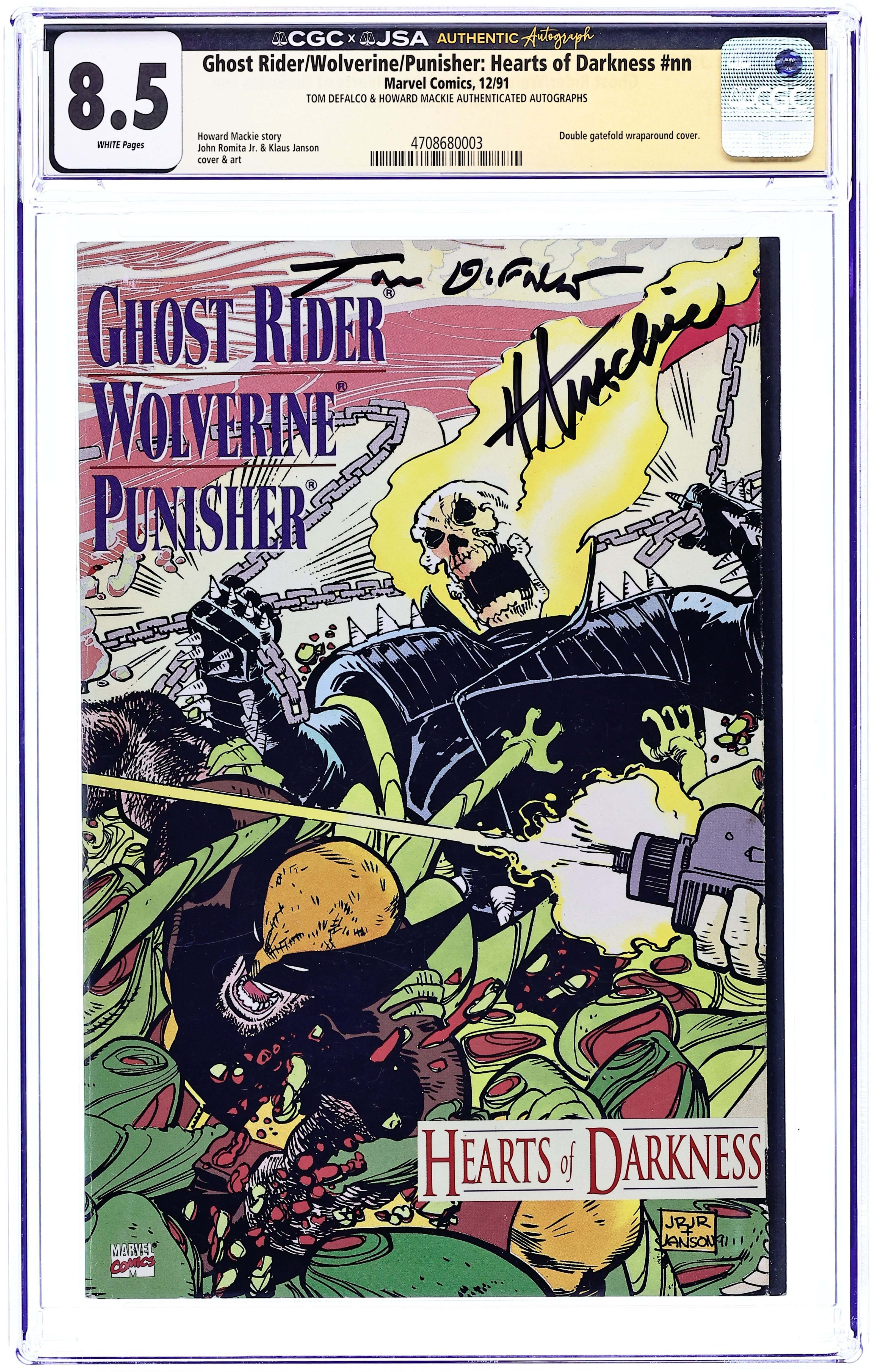 It would take the greatest of evils to stand against the combined power of Ghost Rider, the Punisher and Wolverine. And that's exactly what they have to face - - Blackheart, the demonic son of Mephisto! Written by Howard Mackie, with art by John Romita, Jr. and Klaus Janson. Fold out front and back cover by Romita, Jr. and Janson. Cover price $4.95.