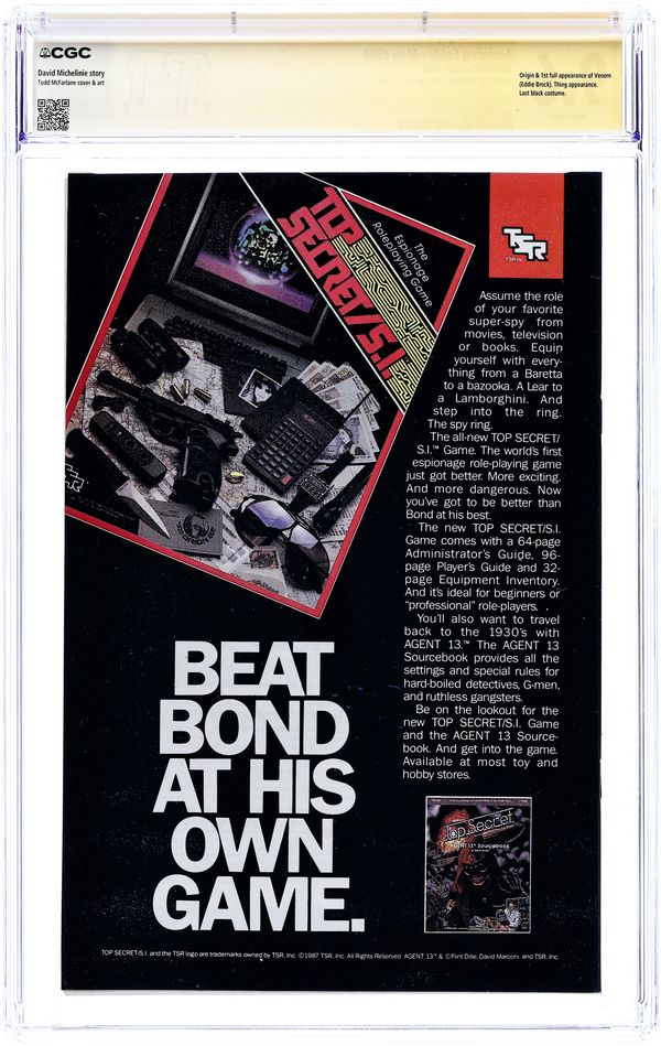 Newsstand Edition. Giant-sized 25th anniversary issue. First full appearance of Venom in "Venom!", script by David Michelinie, art by Todd McFarlane; Spidey's old alien costume has merged with reporter Eddie Brock who thinks his career was ruined by Spider-Man and the symbiote of the two, Venom, takes on the web slinger; At MJ's request, Spidey returns to the blue and red costume as she now finds his black duds way too creepy; This is the last issue in which Spider-Man appears in his black costume; Thing (of the Fantastic Four) cameo.. Stan's Soapbox Special in place of letters page: Full page editorial by Stan on the occasion of Spider-Man's 300th issue. 52 pgs., full color. Cover price $1.50.