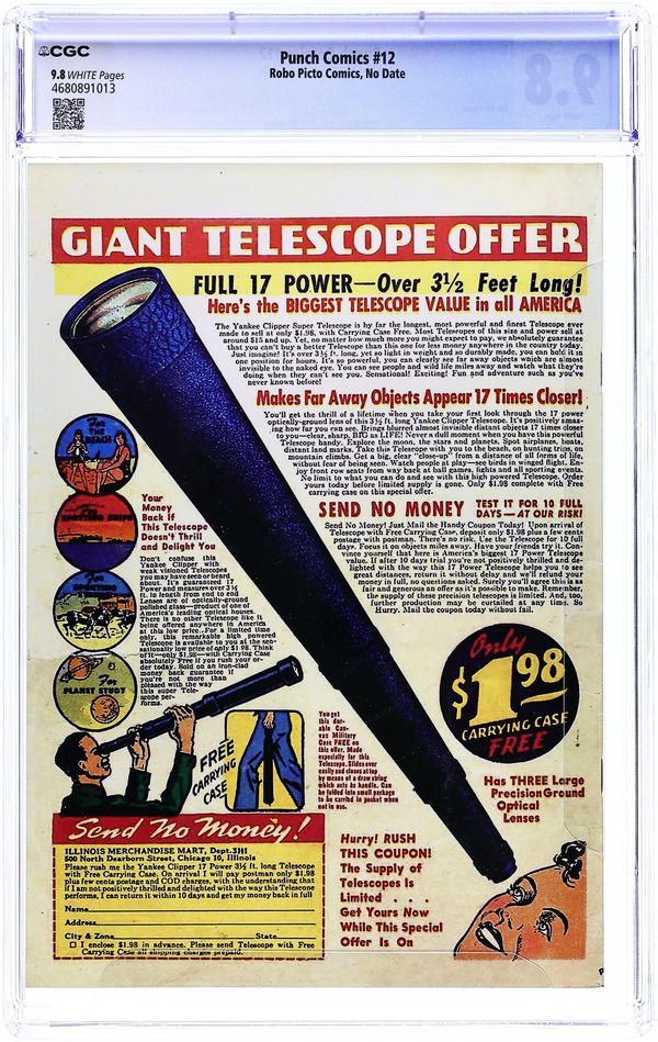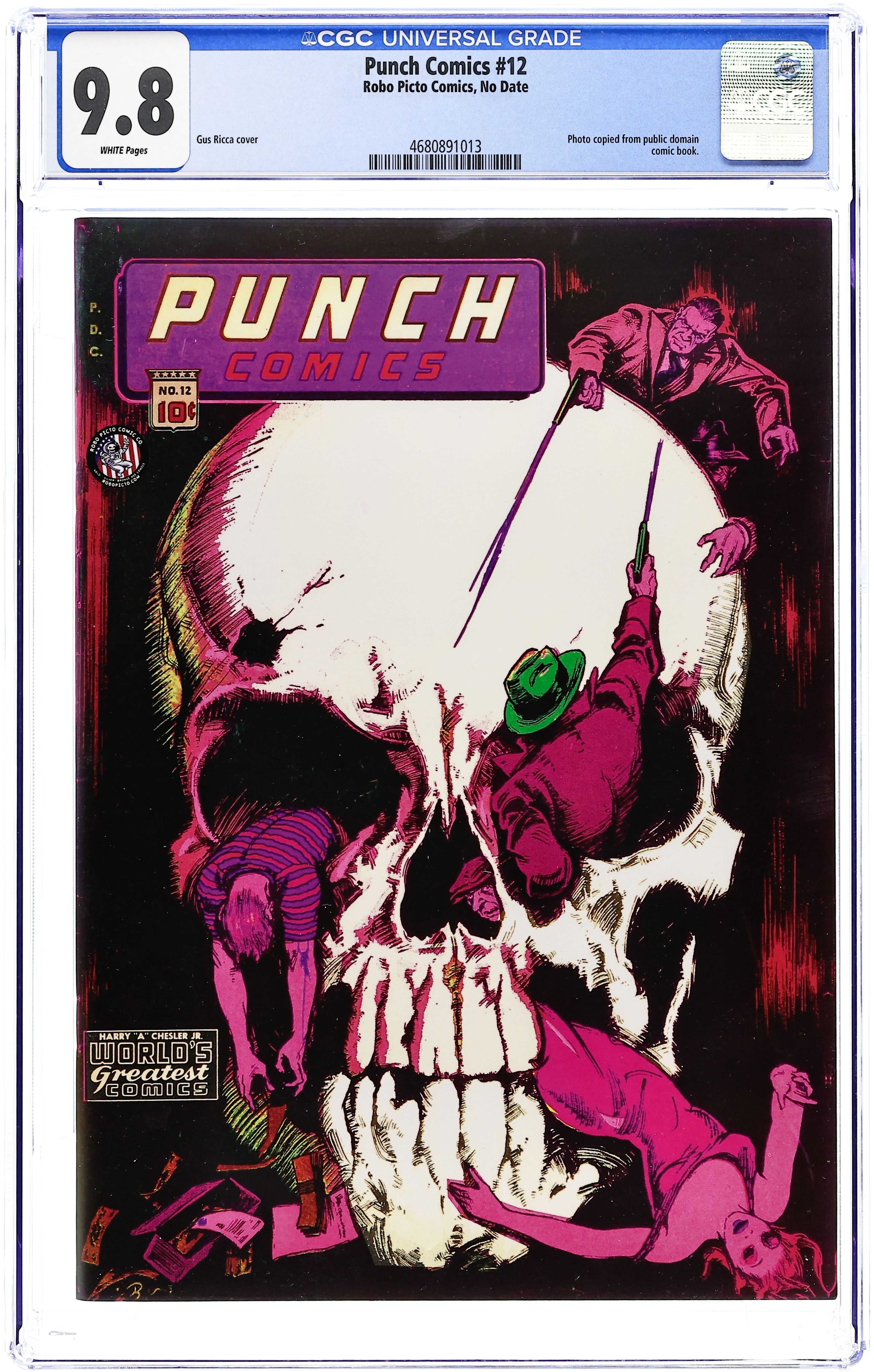 Robo Picto Comics Photo-Copied Reprint of Punch Comics (1941 Chesler/Dynamic) #12 - limited to 100 copies. Cover by Gus Ricca. Stories and art by Joe Beck, Otto Eppers and Bernard Sachs. An early superhero and adventure anthology published by Harry Chesler. Master Key uses his X-ray vision to seek an emerald stolen from an antiques dealer and clear a reformed ex-convict. Captain Glory investigates after skeletal horsemen with the touch of death attack a mine. Rocketman bequeaths his flying suit to young Billy Wood after Billy's father disappears in the jungle, and Rocketboy is born. Wicked cover by Gus Ricca. Punch & Cutey; Master Key; Captain Glory; Sacrifice; Happy Landing; Hale the Magician; Handy Andy; Yankee Boy: Gambler's Payoff; Rocketboy. 52 pages, Full Color.