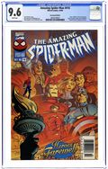 Newsstand Edition. Cover pencils by Mark Bagley, inks by Larry Mahlstedt. Onslaught epilogue, "The Road Back," script by Tom DeFalco, pencils by Ron Garney, inks by Al Williamson; While the city recovers from Onslaught's attack, Spider-Man unknowingly busts up the Rose's attempt to cripple Fortunato's operations; Meanwhile, decreased revenue and repairs to the damaged Bugle building force Jonah to lay off some employees including Kate Cushing; Elsewhere, Scrier meets with Rose, insisting he is his future partner; Unable to get into his apartment with Jimmy-6 there (SM #70, '96), Spider-Man goes for a swing; Peter arrives at the Bugle to see Jacob Conover fired; Robbie fires Peter next; Later, Scrier returns to Gaunt's warehouse where he removes his mask, revealing he is possibly a normal man in disguise; Spider-Man finds two kids, Aleishia and Kadril, fighting over whether mutants were responsible for the deaths of the city's heroes; He takes them web-slinging, telling them that assigning blame only diminishes the heroes' sacrifice. Cameos by Thor, Captain America, Iron Man, and the Fantastic Four. 36 pgs., full color. $1.50. Cover price $1.50.