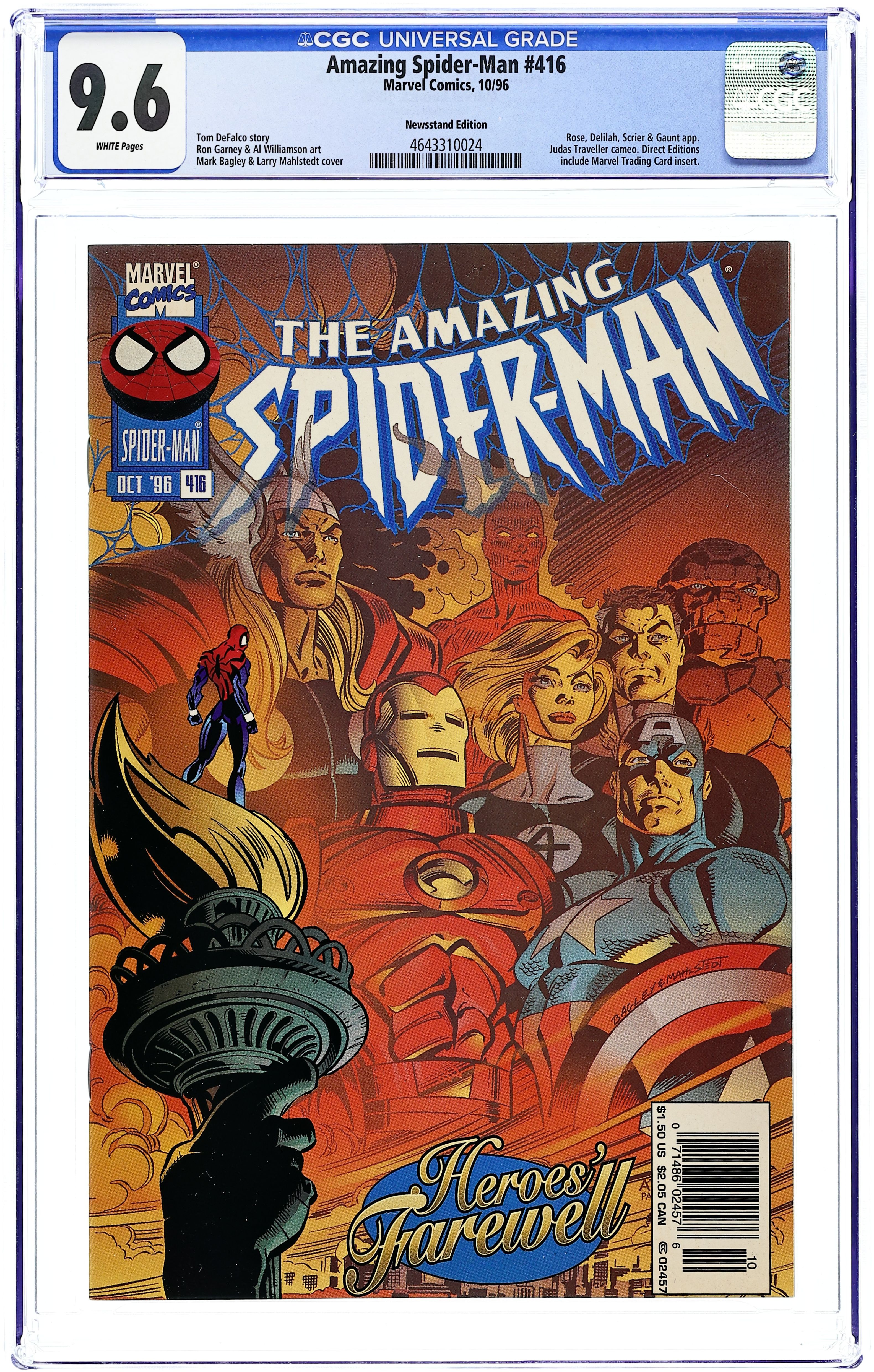 Direct Edition. Cover pencils by Mark Bagley, inks by Larry Mahlstedt. Onslaught epilogue, "The Road Back," script by Tom DeFalco, pencils by Ron Garney, inks by Al Williamson; While the city recovers from Onslaught's attack, Spider-Man unknowingly busts up the Rose's attempt to cripple Fortunato's operations; Meanwhile, decreased revenue and repairs to the damaged Bugle building force Jonah to lay off some employees including Kate Cushing; Elsewhere, Scrier meets with Rose, insisting he is his future partner; Unable to get into his apartment with Jimmy-6 there (SM #70, '96), Spider-Man goes for a swing; Peter arrives at the Bugle to see Jacob Conover fired; Robbie fires Peter next; Later, Scrier returns to Gaunt's warehouse where he removes his mask, revealing he is possibly a normal man in disguise; Spider-Man finds two kids, Aleishia and Kadril, fighting over whether mutants were responsible for the deaths of the city's heroes; He takes them web-slinging, telling them that assigning blame only diminishes the heroes' sacrifice. Cameos by Thor, Captain America, Iron Man, and the Fantastic Four. 36 pgs., full color. $1.50. Cover price $1.50.